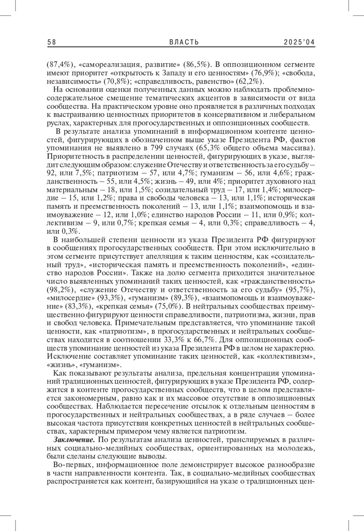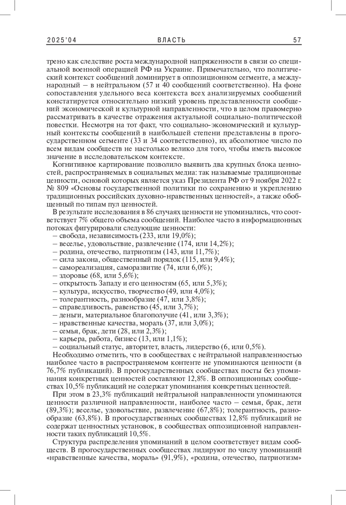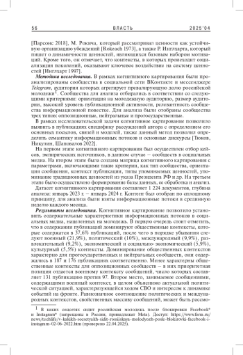 В статье представлены результаты прикладного исследования социальных медиа как одного из источников ценностных установок российской молодежи. Анализ информационных потоков в социальных медиа позволил выделить два основных типа сообществ: прогосударственные, которые являются цифровым плацдармом для продвижения ценностей, соответствующих указу Президента РФ от 09.11.2022 № 809 «Об утверждении Основ государственной политики по сохранению и укреплению традиционных российских духовно-нравственных ценностей», а также оппозиционные сообщества, в т. ч. цифровые ресурсы ЛОМов и иноагентов, формирующие контрценностные потоки, базирующиеся на западных ценностях и нацеленные на вовлечение молодежи в них.