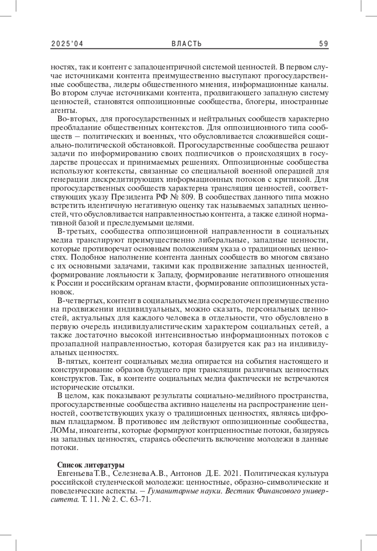 1. 	Евгеньева Т.В., Селезнева А.В., Антонов Д.Е. 2021. Политическая культура российской студенческой молодежи: ценностные, образно-символические и поведенческие аспекты. - Гуманитарные науки. Вестник Финансового университета. Т. 11. № 2. С. 63-71. EDN: ORHIAC