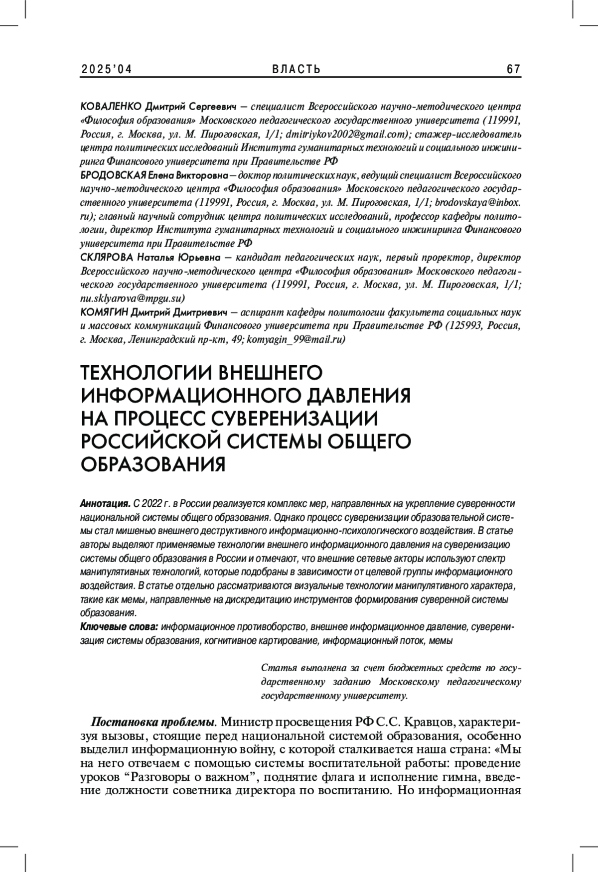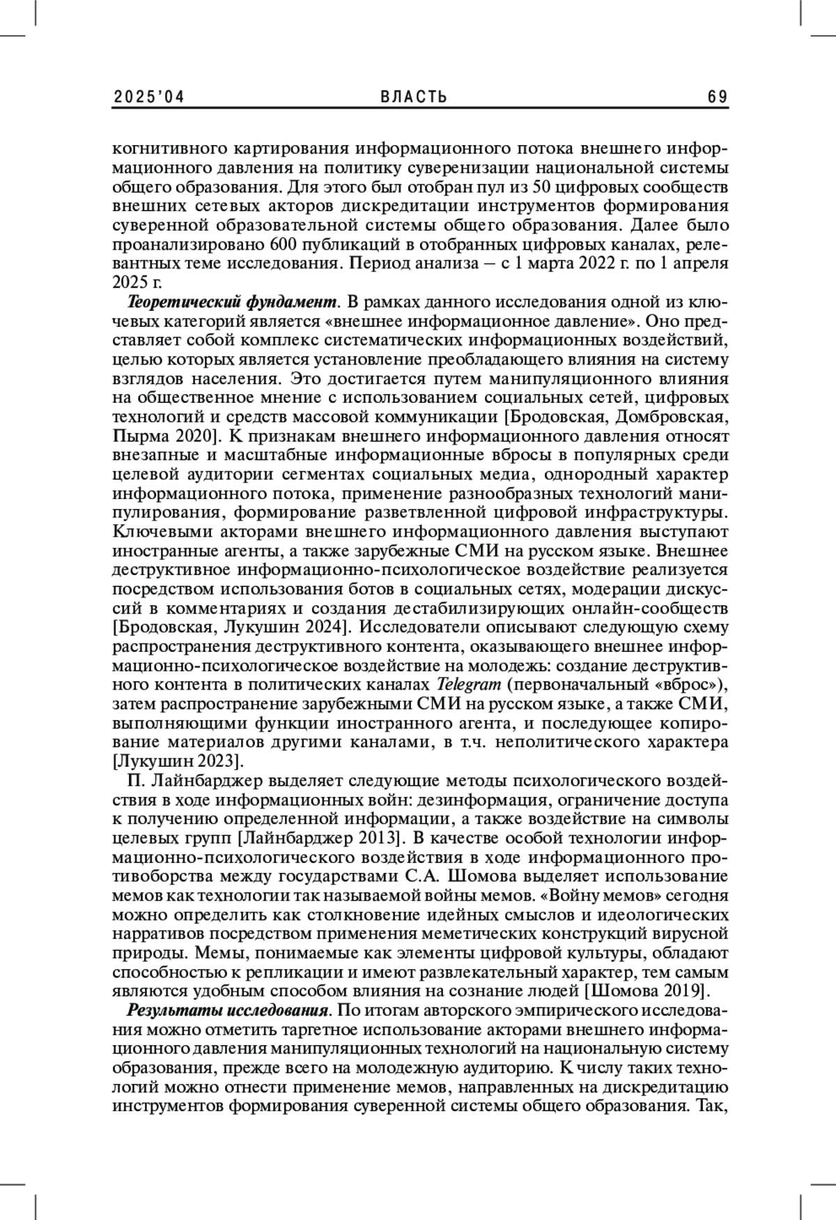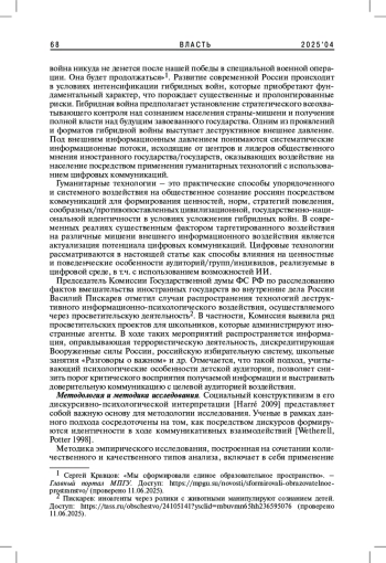 4. Лукушин В.А. 2023. Внешнее информационное давление на российскую молодежь как инструмент глобального противоборства. - Общественные науки и современность. № 3. С. 68-82. EDN: GHVNCJ