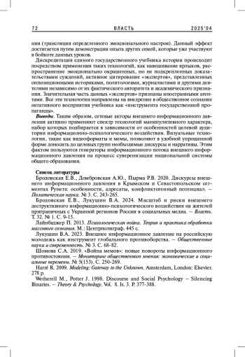 1. Бродовская Е.В., Домбровская А.Ю., Пырма Р.В. 2020. Дискурсы внешнего информационного давления в Крымском и Севастопольском сегментах Рунета: особенности, адресаты, конфликтогенный потенциал. - Политическая наука. № 3. С. 243-265. EDN: YFVBTI