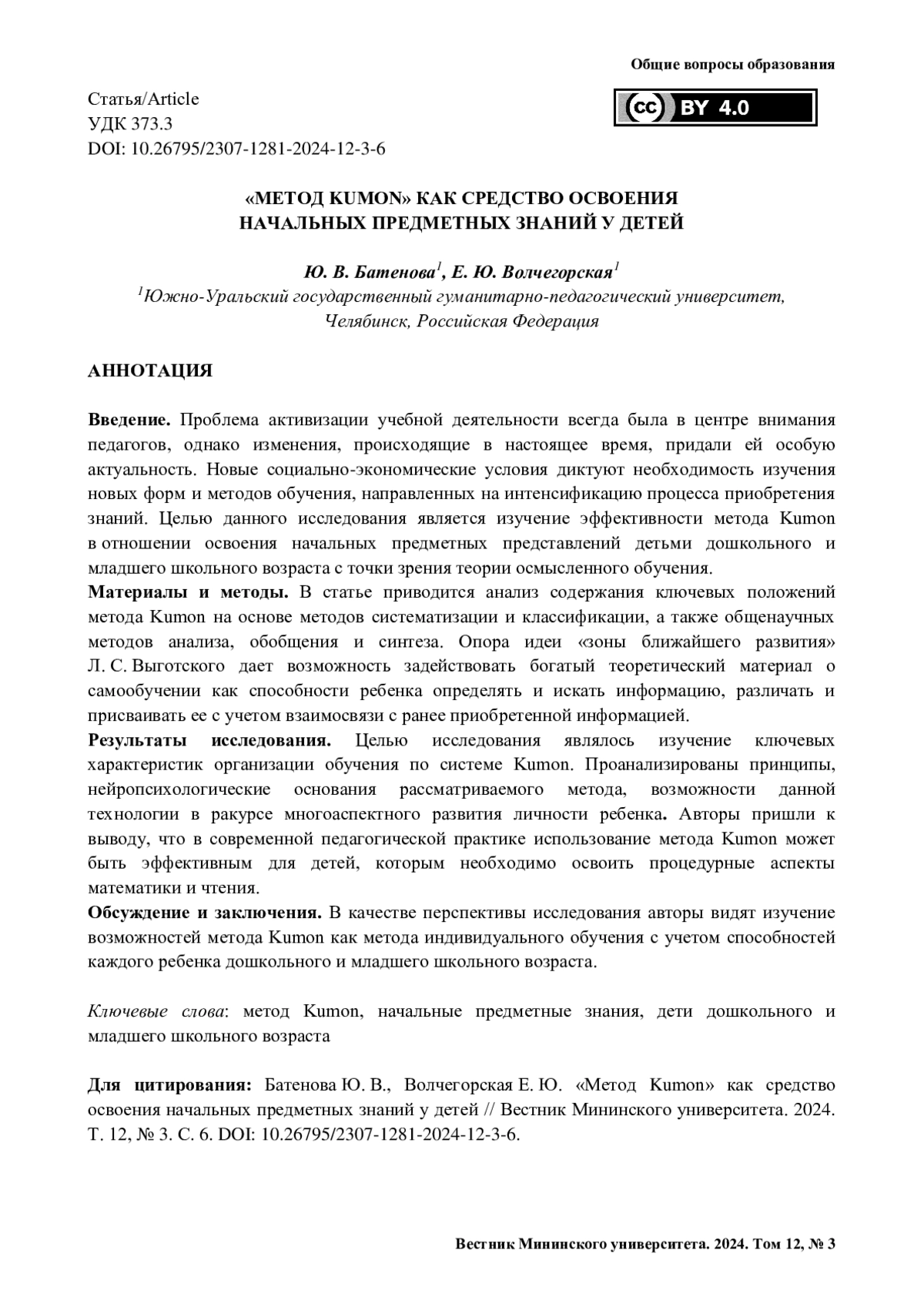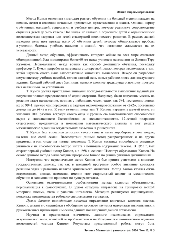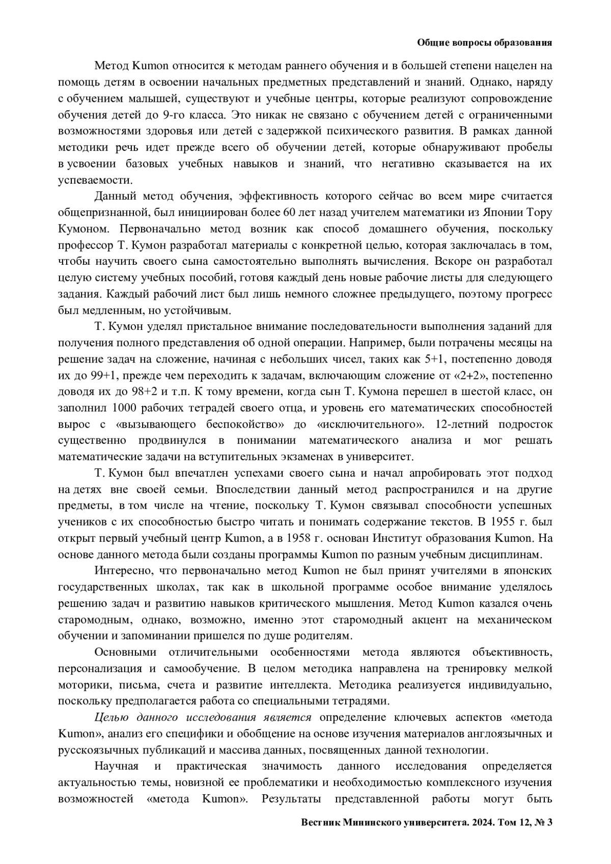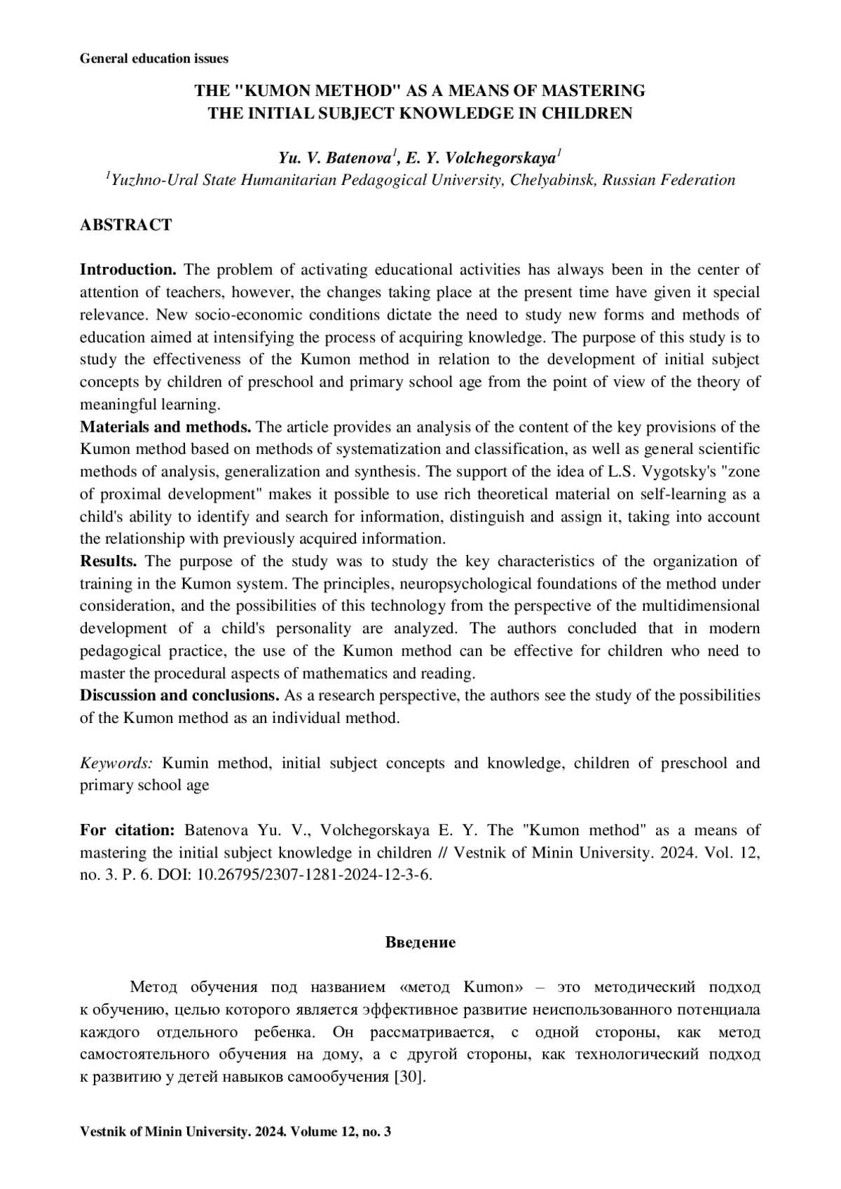 Обсуждение и заключения. В качестве перспективы исследования авторы видят изучение возможностей метода Kumon как метода индивидуального обучения с учетом способностей каждого ребенка дошкольного и младшего школьного возраста.