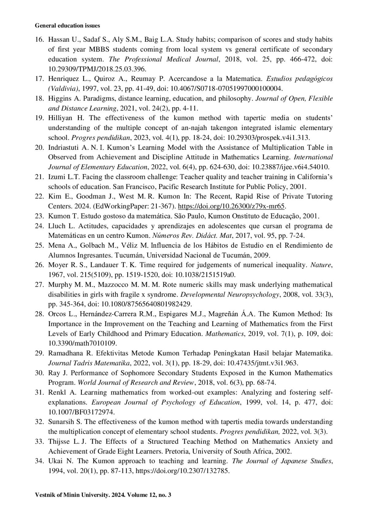28. Orcos L., Hernández-Carrera R.M., Espigares M.J., Magreñán Á.A. The Kumon Method: Its Importance in the Improvement on the Teaching and Learning of Mathematics from the First Levels of Early Childhood and Primary Education // Mathematics. 2019. Vol. 7(1). P. 109. https://doi.org/10.3390/math7010109.