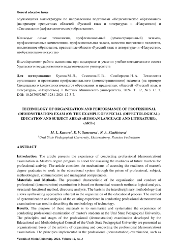 Обсуждение и заключения. Оптимальной формой проведения демонстрационного экзамена педагогов определена соответствующая его задачам технология деятельностного типа, основанная на активном способе взаимодействия участников, – деловая игра. В ходе деловой игры экзаменуемые магистранты моделируют ситуацию заседания методического объединения или педагогического совета, где реализуют решение профессиональной задачи. Содержательные аспекты профессионального (демонстрационного) экзамена раскрываются в статье на материале конкретных иллюстраций вариантов экзаменационных заданий для обучающихся магистратуры по направлениям подготовки «Педагогическое образование» (на примере предметных областей «Русский язык и литература» и «Искусство») и «Специальное (дефектологическое) образование».