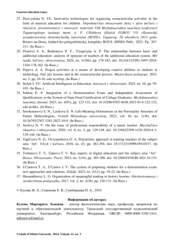 34. Тагильцева Н. Г., Овсянникова О. А. Полихудожественный подход в подготовке учителей предметной области «Искусство» // Язык и культура. 2018. № 43. С. 282-294. https://doi.org/10.17223/19996195/43/17.