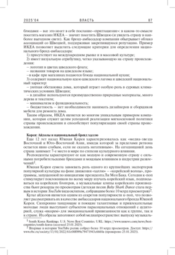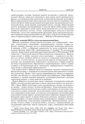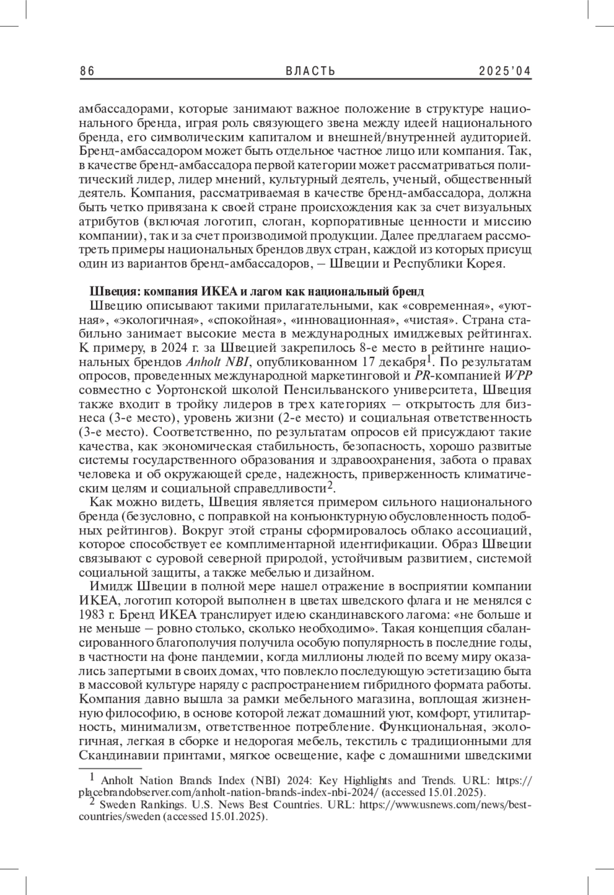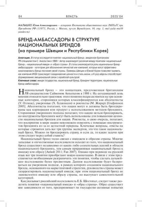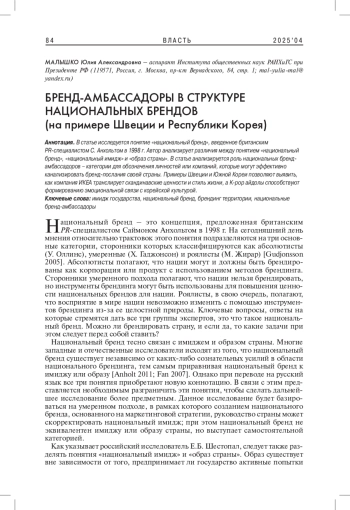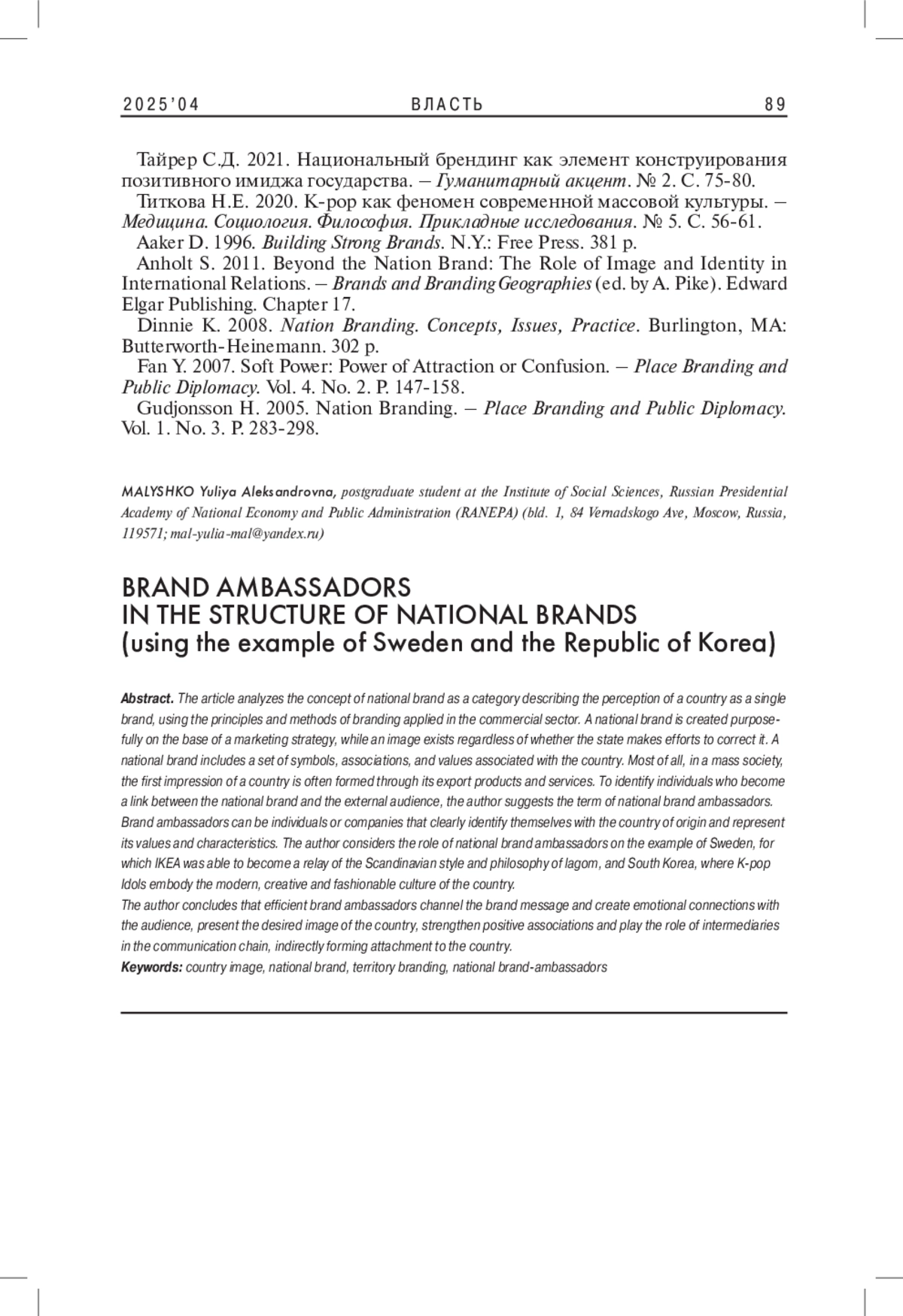 В статье исследуется понятие «национальный бренд», введенное британским PR-специалистом С. Анхольтом в 1998 г. Автор анализирует различия между понятием «национальный бренд», «национальный имидж» и «образ страны». В статье анализируется роль национальных бренд-амбассадоров - категории для обозначения личностей или компаний, которые могут эффективно канализировать бренд-послания своей страны. Примеры Швеции и Южной Кореи позволяют выявить, как компания ИКЕА транслирует скандинавские ценности и стиль жизни, а K-pop айдолы способствуют формированию эмоциональной связи с корейской культурой.