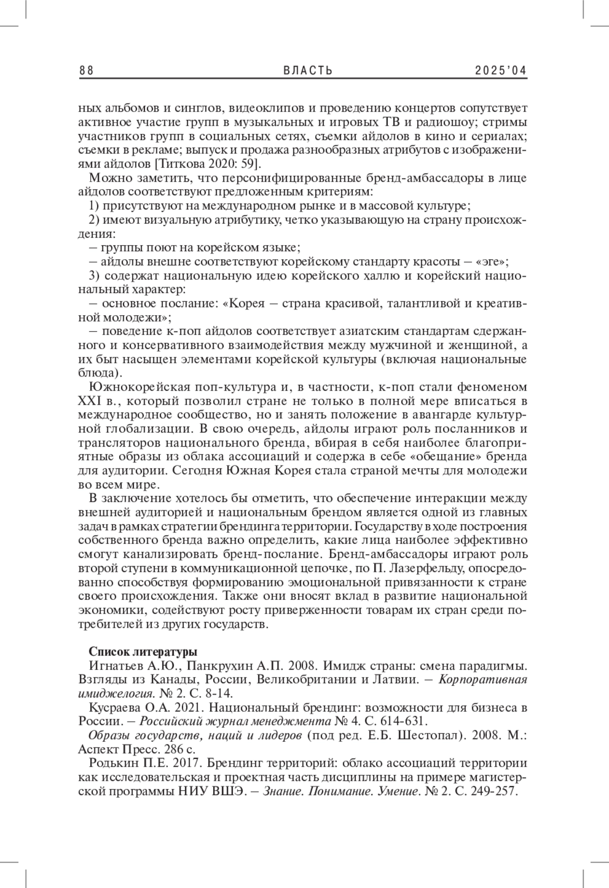 2. 	Кусраева О.А. 2021. Национальный брендинг: возможности для бизнеса в России. - Российский журнал менеджмента № 4. С. 614-631. EDN: BNDRKO
