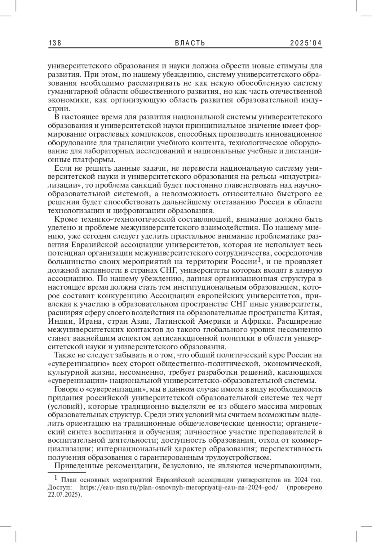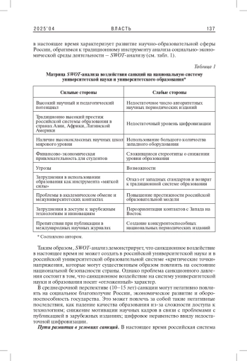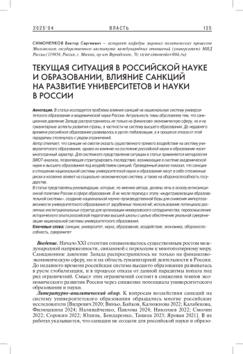 В статье исследуется проблема влияния санкций на национальную систему университетского образования и академической науки России. Актуальность темы обусловлена тем, что санкционное давление Запада распространилось не только на финансово-экономическую сферу, но и на гуманитарные аспекты развития страны, в частности на систему высшего образования. До недавнего времени российское образование развивалось в русле глобализации, а в процессе отказа от этой парадигмы столкнулось с рядом ограничений. Автор отмечает, что санкции не смогли оказать существенного прямого воздействия на систему университетского образования, однако их влияние на состояние российской науки и образования носит многогранный характер. Для системного представления ситуации в статье применяется методология SWOT-анализа, позволяющая структурировать последствия, возникающие в системе академической науки и высшего образования под воздействием санкций. Проведенный анализ показал, что санкции в отношении национальной системы университетской науки и образования несут в себе отложенные риски и косвенно влияют на социально-экономическую систему, а также на обороноспособность государства. В статье представлены рекомендации, которые, по мнению автора, должны лечь в основу антисанкционной политики России в сфере образования. В их числе переход к этапу «индустриализации образовательной системы», создание национальной научно-производственной базы для снижения импортозависимости университетского образования от зарубежных технологий; использование потенциала различных институциональных структур для организации межвузовского сотрудничества; переосмысление исторического опыта российской педагогики высшей школы с целью обеспечения реальной суверенизации национальной системы университетского образования.