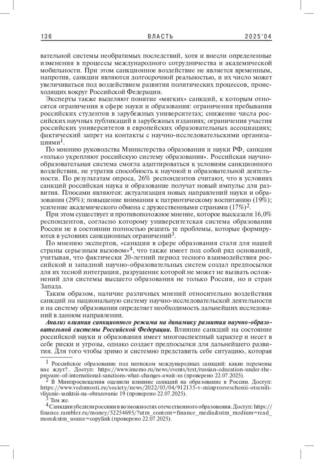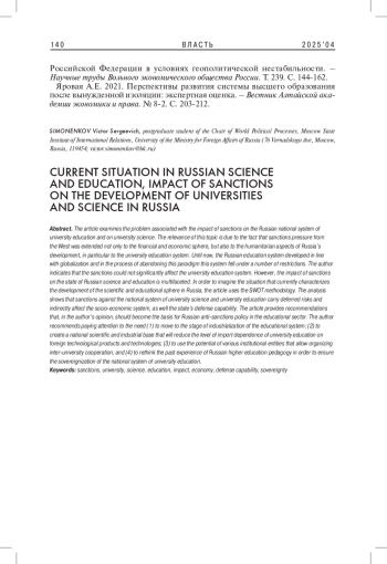 6. 	Смолин О.Н. 2022. Наука и образование в условиях санкций: первоочередные антикризисные меры. - Научные труды Вольного экономического общества России. Т. 35. С. 40-58. EDN: ZKLJGQ