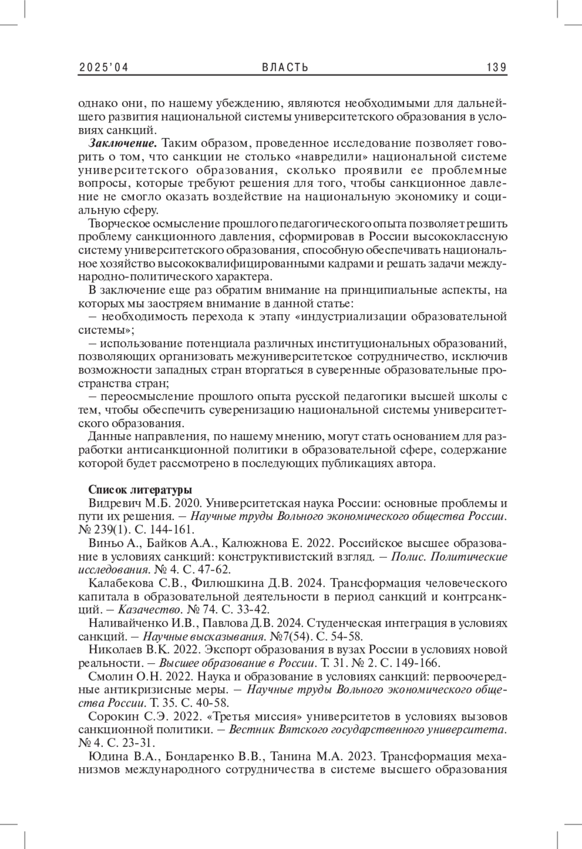 1. 	Видревич М.Б. 2020. Университетская наука России: основные проблемы и пути их решения. - Научные труды Вольного экономического общества России. № 239(1). С. 144-161.