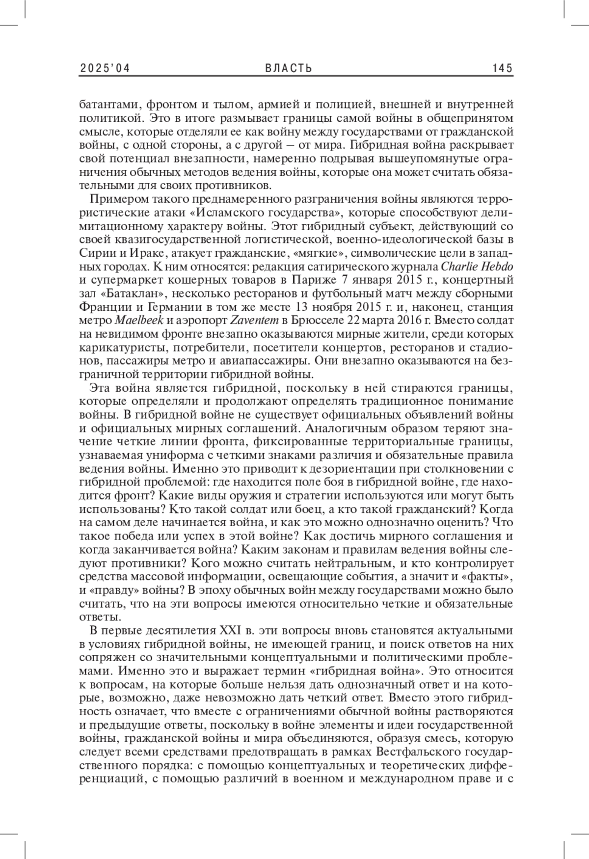 Статья посвящена пониманию природы гибридной войны, собирательный термин которой описывает ее как агрессию, находящуюся в серой зоне между войной и миром, сочетание военных и невоенных способов ведения войны с целью достижения определенных политических, экономических или иных целей. Автор утверждает, что избежать или преодолеть нормативные и стратегические дилеммы, которые несет с собой «война без границ», вряд ли возможно без пересмотра исторически сложившегося понимания войны. Поэтому фокус исследования смещается на рассмотрение традиционного понимания войны как симметричного и регулируемого на международном уровне противостояния двух противников, а также сложной взаимосвязи между историческим военным опытом и вытекающими из него идеями войны. Подводя итоги, автор отмечает, что гибридная сущность войны не поддается четкому концептуальному определению, но, тем не менее, может быть понята в своих разнородных элементах и характеристиках, являясь полезным средством для размышлений о прошлом, настоящем и будущем войны.