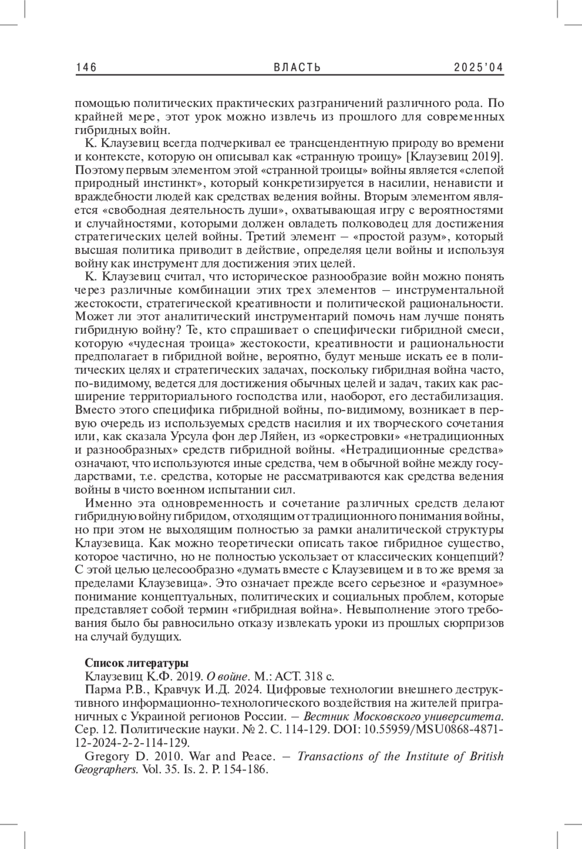 3. Gregory D. 2010. War and Peace. - Transactions of the Institute of British Geographers. Vol. 35. Is. 2. P. 154-186.