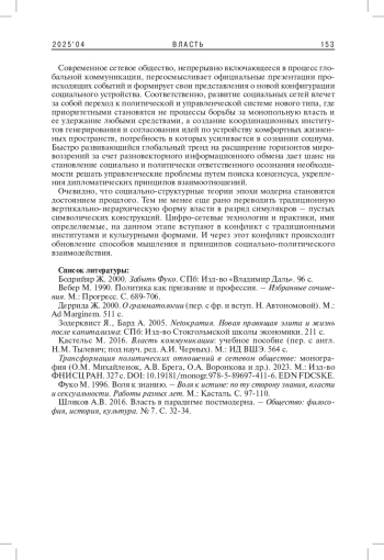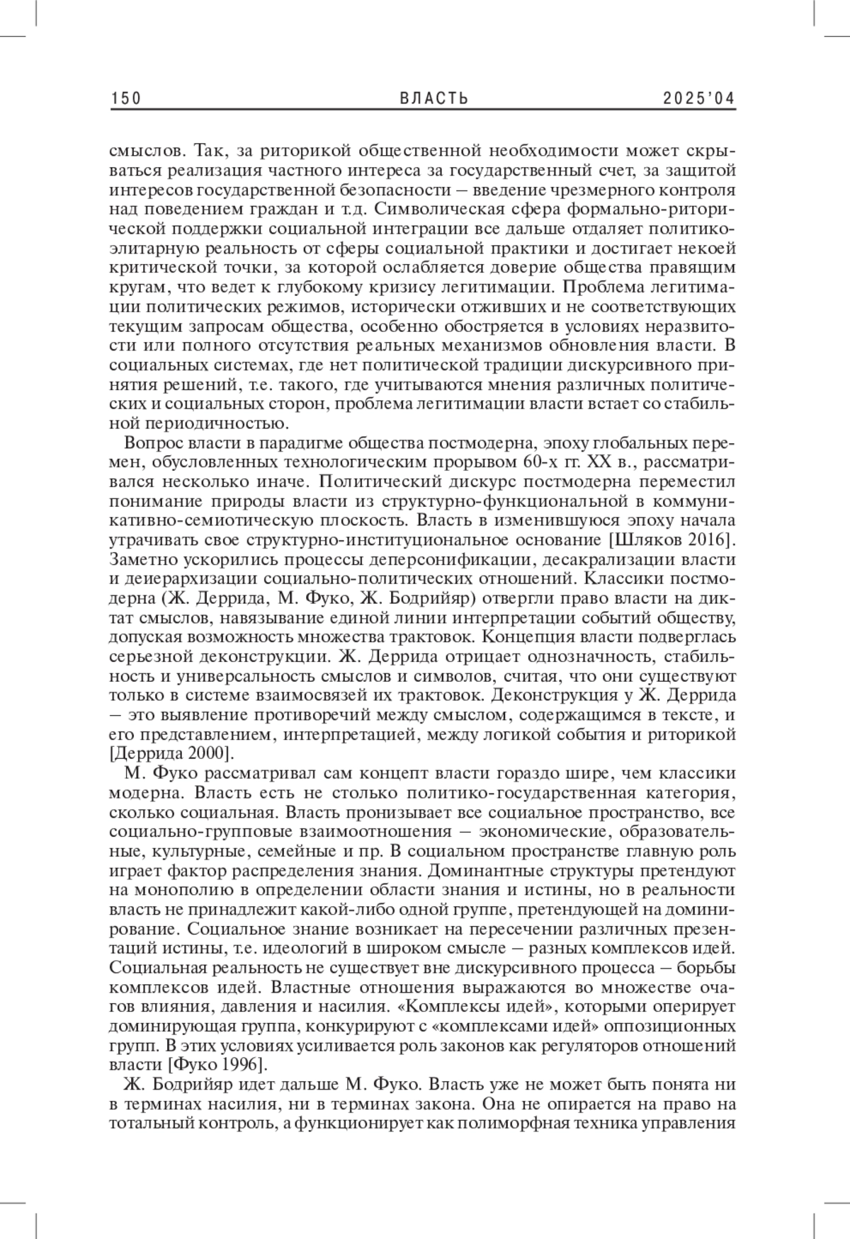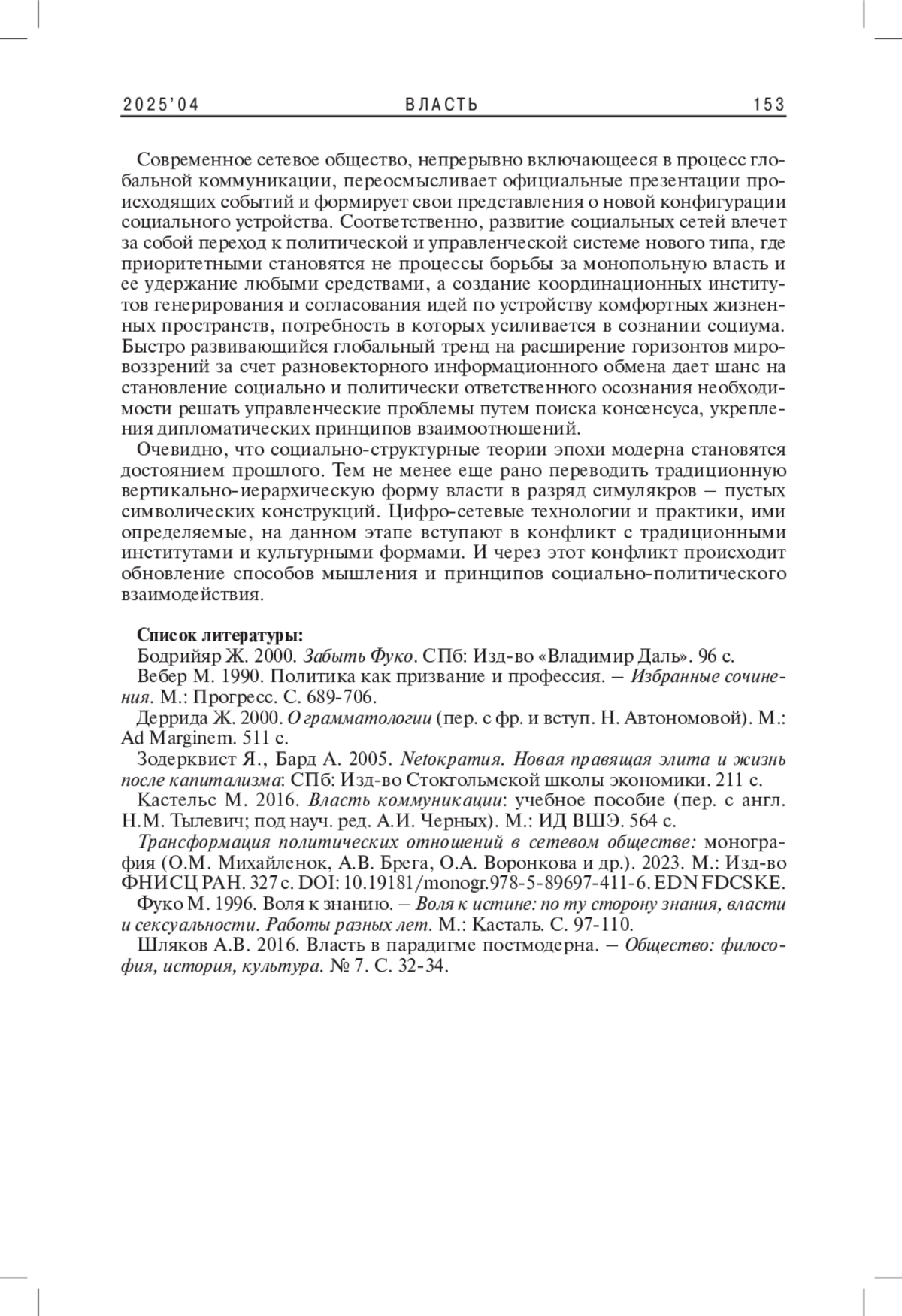 8. 	Шляков А.В. 2016. Власть в парадигме постмодерна. - Общество: философия, история, культура. № 7. С. 32-34. EDN: WGBUVT