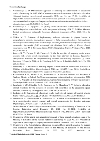 3. Абкович А. Я., Сыроваткина-Сидорина К. Б. Исследование профессиональных представлений педагогов в области организации промежуточной аттестации обучающихся с ограниченными возможностями здоровья на уровне основного общего образования // Воспитание и обучение детей с нарушениями развития. 2024. № 4. С. 58-68. https://doi.org/10.47639/2074-4986_2024_4_58.