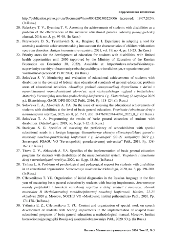 20. Палецкая Т. В., Рюмина Т. В. Оценка достижений обучающихся с ограниченными возможностями здоровья как проблема эффективности инклюзивного образовательного процесса // Сибирский педагогический журнал. 2016. № 5. С. 93-98.