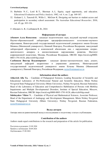 27. Титова О. В., Абкович А. Я. Специфика реализации программ основного общего образования для обучающихся с нарушениями опорно-двигательного аппарата // Воспитание и обучение детей с нарушениями развития. 2020. № 8. С. 48-56.