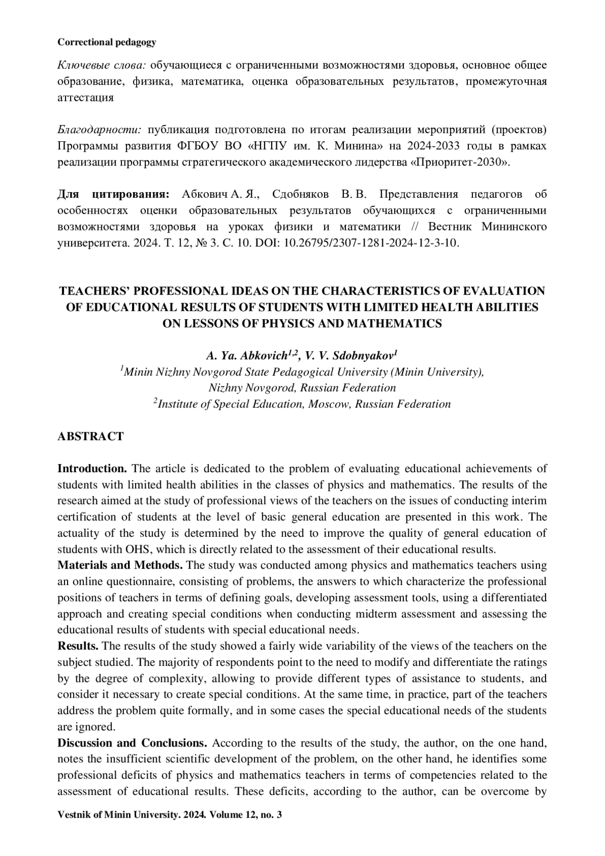 Введение. В статье рассматриваются вопросы оценки образовательных достижений обучающихся с ограниченными возможностями здоровья (ОВЗ) на уроках физики и математики. Представлены результаты исследования, направленного на изучение профессиональных представлений педагогов по вопросам проведения промежуточной аттестации школьников c ОВЗ на уровне основного общего образования. Актуальность исследования определяется необходимостью повышения качества общего образования обучающихся с ОВЗ, которое непосредственно связано с оценкой их образовательных результатов.
