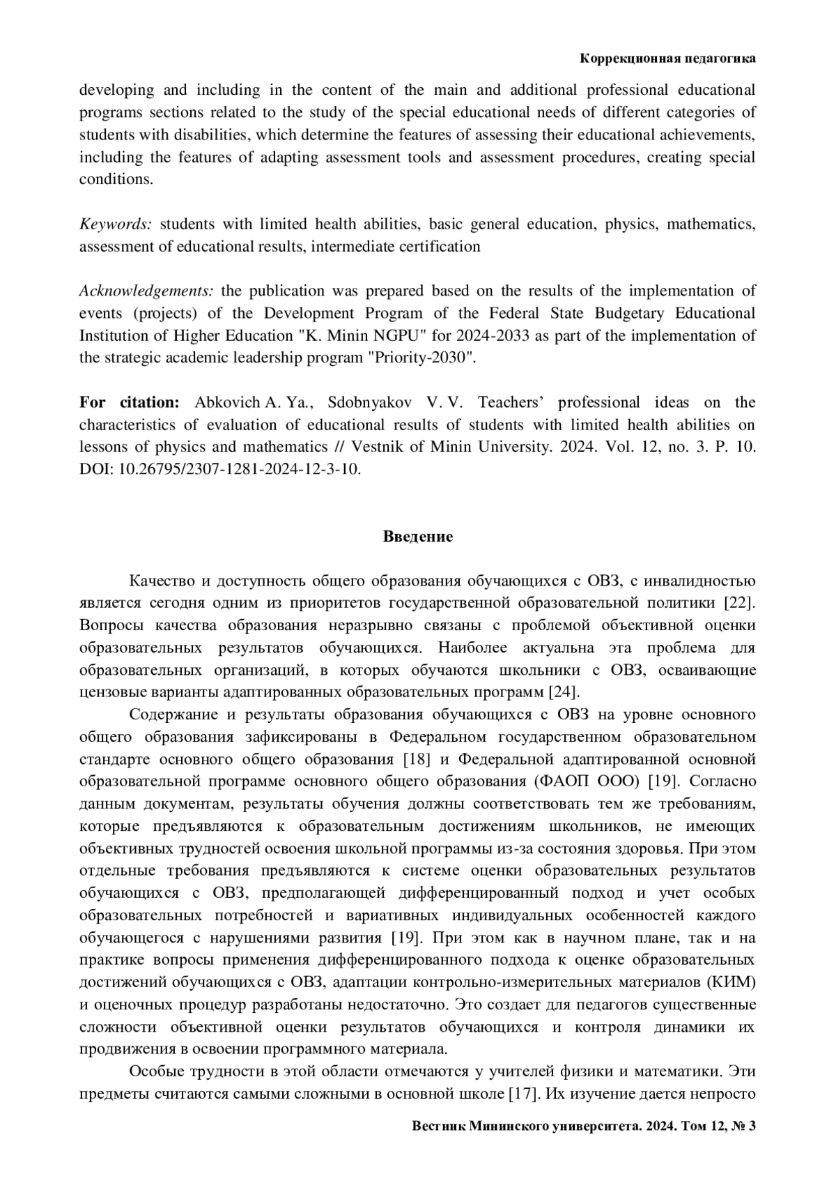 Обсуждение и заключения. По результатам исследования автор, с одной стороны, отмечает недостаточную научную разработанность проблемы, с другой – выделяет некоторые профессиональные дефициты учителей физики и математики в части компетенций, связанных с оценкой образовательных результатов. Данные дефициты, по мнению автора, могут быть преодолены за счет разработки и включения в содержание основных и дополнительных профессиональных образовательных программ разделов, связанных с изучением особых образовательных потребностей разных категорий обучающихся с ОВЗ, определяющих особенности оценки их образовательных достижений, включая особенности адаптации оценочных средств и процедуры оценивания, создания специальных условий.