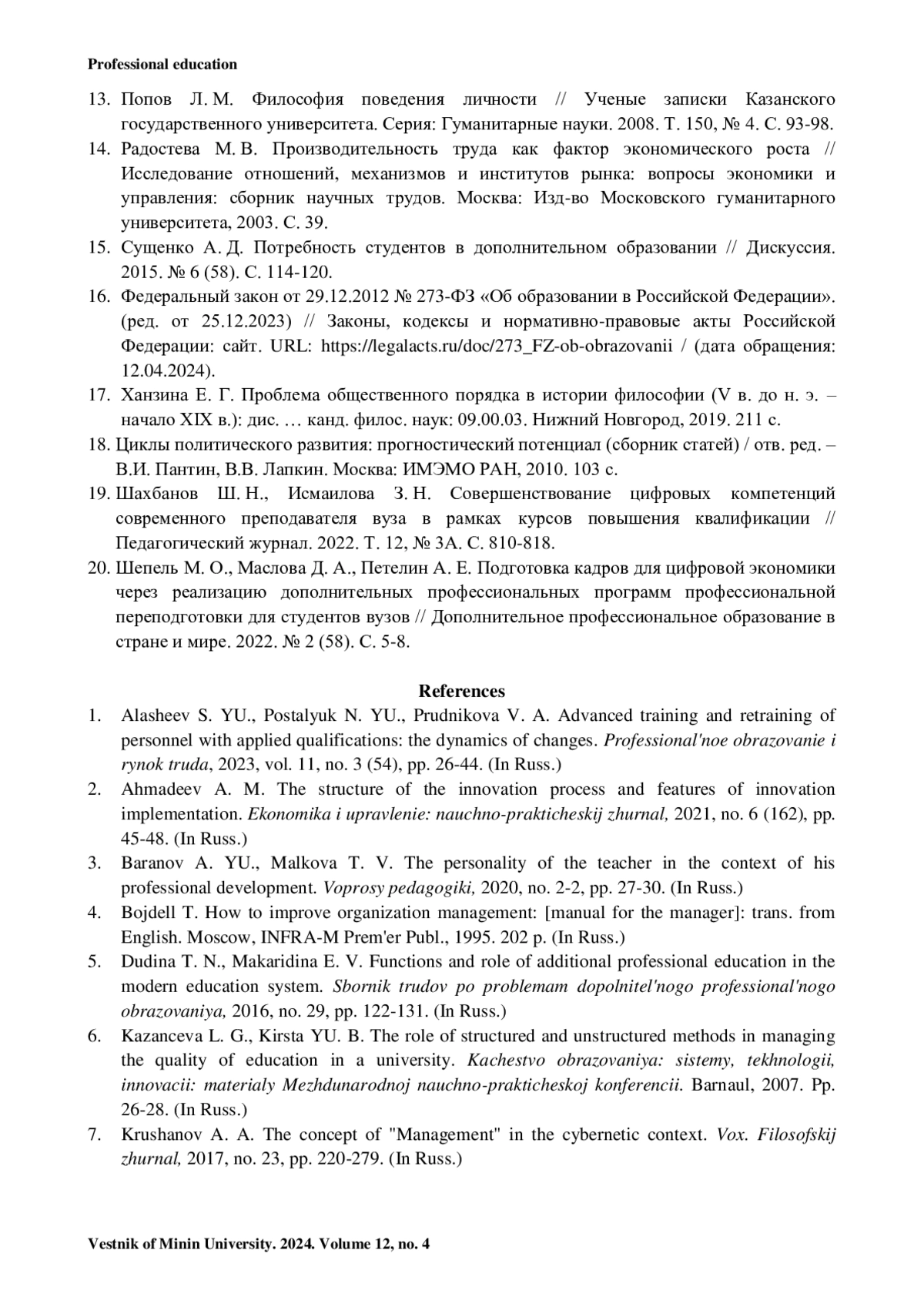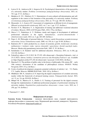 1. Алашеев С. Ю., Посталюк Н. Ю., Прудникова В. А. Повышение квалификации и переподготовка кадров с прикладными квалификациями: динамика изменений // Профессиональное образование и рынок труда. 2023. Т. 11, № 3 (54). С. 26-44.