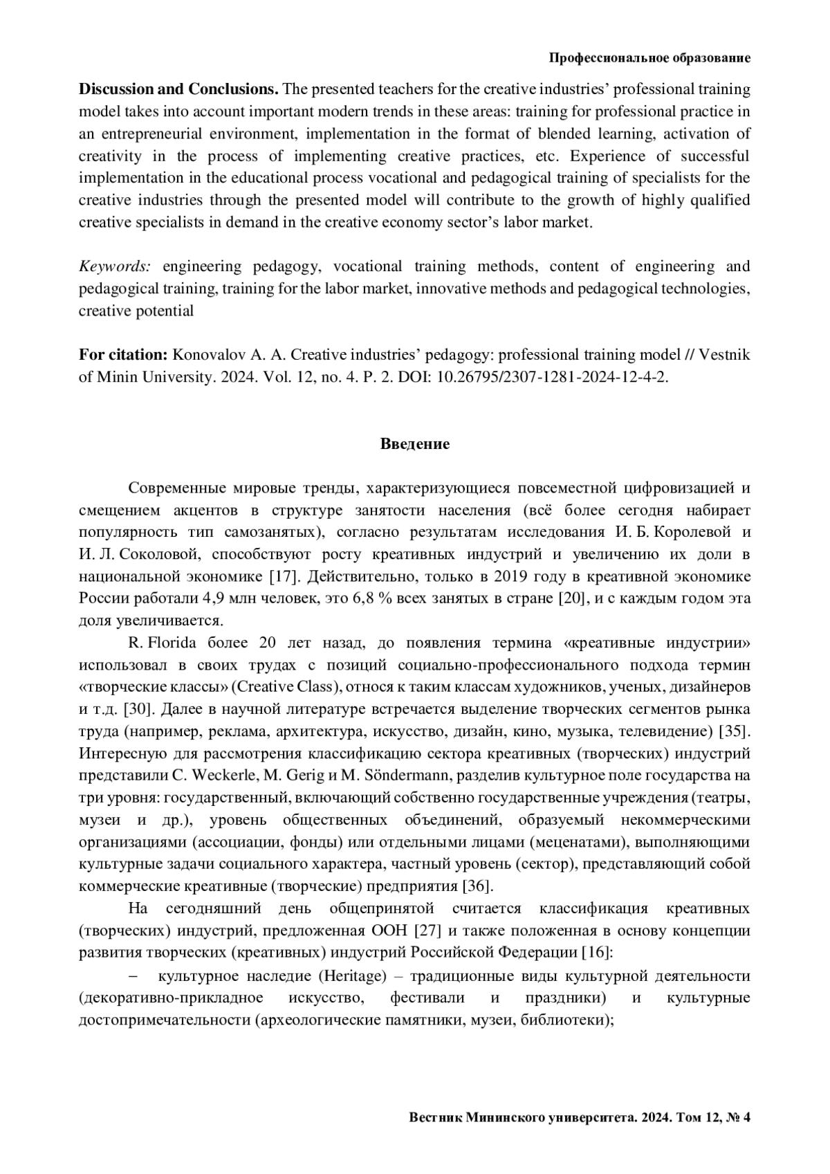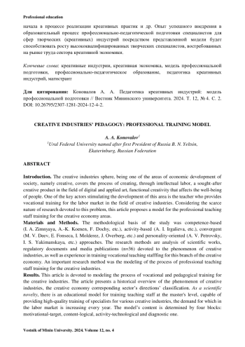 Введение: Сфера креативных индустрий, являясь одним из направлений развития экономики общества, а именно креативной, охватывает процесс создания посредством интеллектуального труда востребованного творческого продукта в области цифрового и прикладного искусства, функционального творчества, влияющего на благосостояние людей. Одним из ключевых акторов, стимулирующих развитие данной сферы, является педагог, обеспечивающий профессиональную подготовку кадров для рынка труда в сфере креативных индустрий. Учитывая дефицитарный характер исследований, посвященных данной проблеме, в настоящей статье предлагается модель профессиональной подготовки профессионально-педагогических кадров для сфер креативной экономики.