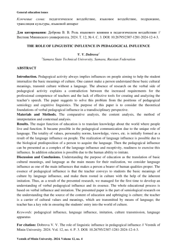Введение. Педагогическая деятельность всегда предполагает воздействия на учащихся с целью усвоения ими базовых смыслов культуры. Сделать человека носителем этих базовых культурных смыслов, транслировать ему культуру без языка невозможно. Отсутствие исследований языковой стороны педагогической деятельности объясняет существующее противоречие между требованиями к профессиональной компетентности педагогов и отсутствием эффективного инструментария создания и анализа речи педагога. В статье предлагается решение обозначенной проблемы с позиций педагогической семиологии и когнитивной лингвистики. Цель данной работы – рассмотрение теоретических основ языкового педагогического воздействия в трансдисциплинарном ракурсе.