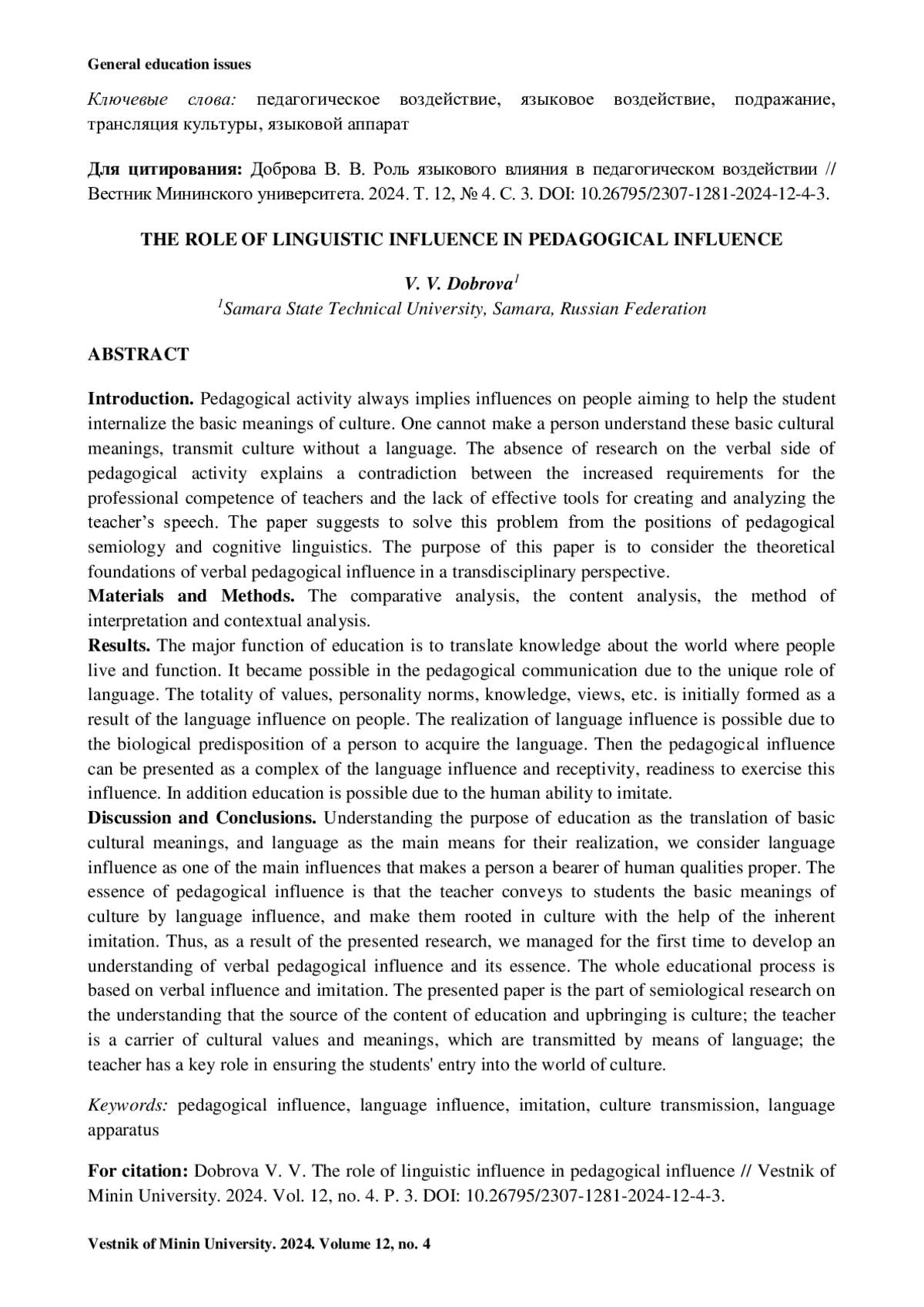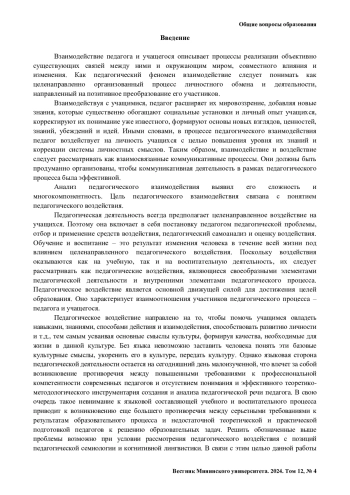 Обсуждение и заключения. Понимая цель образования как трансляцию базовых культурных смыслов, а язык как основное средство для ее осуществления, мы считаем языковое воздействие главным воздействием в формировании человека как носителя собственно человеческих качеств. Сущность педагогического воздействия состоит в том, что с помощью языкового воздействия педагог должен донести до ученика базовые смыслы культуры, а с помощью присущего ученику подражания сделать так, чтобы он укоренился в культуре. Таким образом, в результате представленного исследования нам впервые удалось выработать понимание языкового педагогического воздействия и его сущности. Весь образовательный процесс основывается на языковом воздействии и подражании. Данная работа является частью семиологического исследования, посвященного осмыслению того, что источником содержания обучения и воспитания является культура; педагог является носителем культурных значений и смыслов, которые передаются им с помощью языка; педагогу принадлежит ключевая роль в обеспечении вхождения обучающихся в мир культуры.