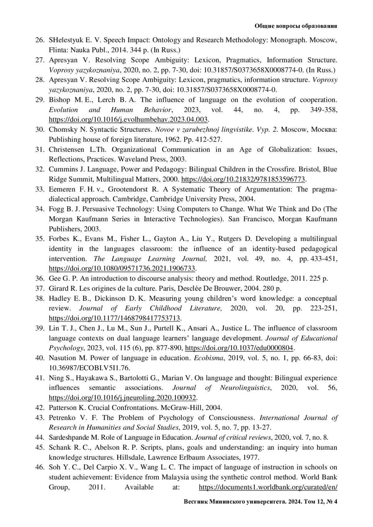38. Lin T. J., Chen J., Lu M., Sun J., Purtell K., Ansari A., Justice L. The influence of classroom language contexts on dual language learners’ language development // Journal of Educational Psychology. 2023. Vol. 115 (6). Pp. 877-890. https://doi.org/10.1037/edu0000804.