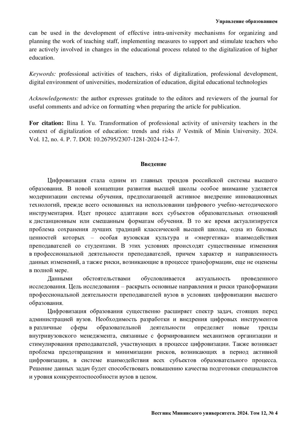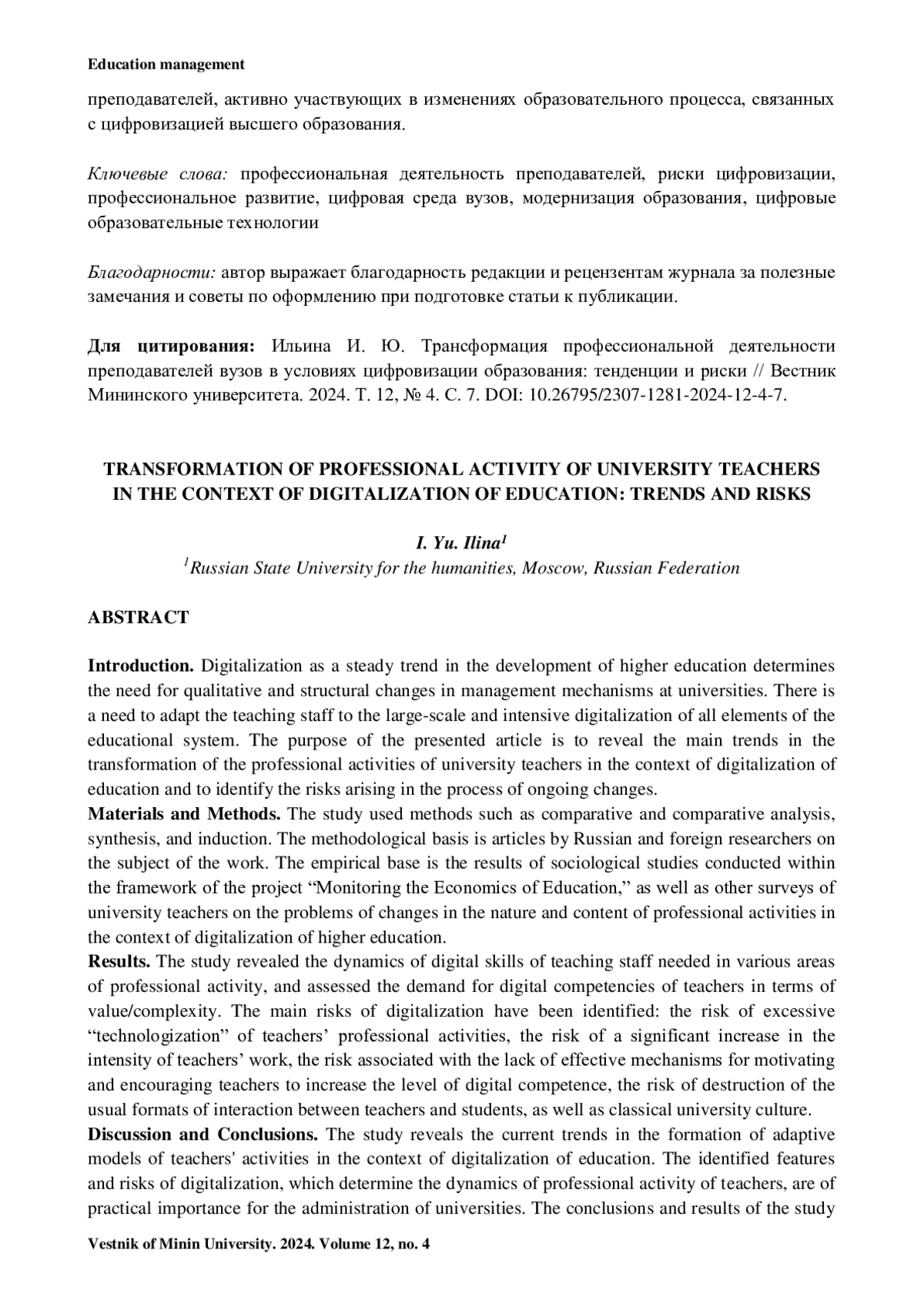 Введение. Цифровизация как устойчивый тренд развития высшей школы определяет потребность в качественном и структурном изменении управленческих механизмов в вузах. Возникает необходимость адаптации профессорско-преподавательского состава к масштабной и интенсивной цифровизации всех элементов образовательной системы. Цель представленной статьи – раскрыть основные тенденции трансформации профессиональной деятельности преподавателей вузов в условиях цифровизации образования и выявить риски, возникающие в процессе происходящих изменений.