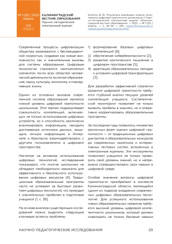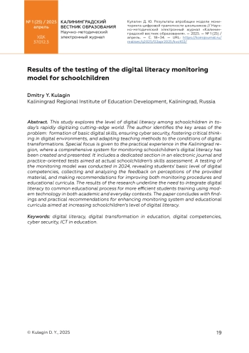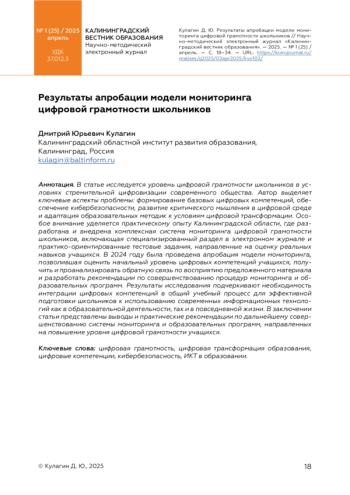 В статье исследуется уровень цифровой грамотности школьников в условиях стремительной цифровизации современного общества. Автор выделяет ключевые аспекты проблемы: формирование базовых цифровых компетенций, обеспечение кибербезопасности, развитие критического мышления в цифровой среде и адаптация образовательных методик к условиям цифровой трансформации. Особое внимание уделяется практическому опыту Калининградской области, где разработана и внедрена комплексная система мониторинга цифровой грамотности школьников, включающая специализированный раздел в электронном журнале и практико-ориентированные тестовые задания, направленные на оценку реальных навыков учащихся. В 2024 году была проведена апробация модели мониторинга, позволившая оценить начальный уровень цифровых компетенций учащихся, получить и проанализировать обратную связь по восприятию предложенного материала и разработать рекомендации по совершенствованию процедур мониторинга и образовательных программ. Результаты исследования подчеркивают необходимость интеграции цифровых компетенций в общий учебный процесс для эффективной подготовки школьников к использованию современных информационных технологий как в образовательной деятельности, так и в повседневной жизни. В заключении статьи представлены выводы и практические рекомендации по дальнейшему совершенствованию системы мониторинга и образовательных программ, направленных на повышение уровня цифровой грамотности учащихся.