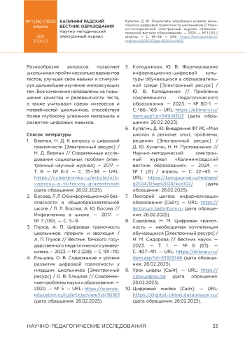 5. 	Колодяжная, Ю. В. Формирование информационно-цифровой культуры обучающихся в образовательной среде [Электронный ресурс] / Ю. В. Колодяжная // Проблемы современного педагогического образования. - 2023. - № 80-1. - С. 166-169. - URL: item.asp?id=54918303 (дата обращения: 26.02.2025).