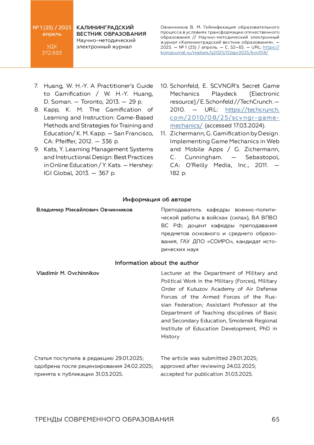 3. 	Орлова, О. В. Геймификация как способ организации обучения / О. В. Орлова, В. Н. Титова // Вестник Томского государственного педагогического университета. - 2015. - № 9 (162). - С. 60-64. EDN: ULYZOZ