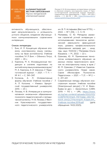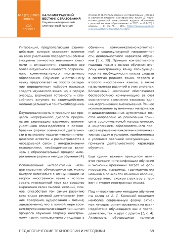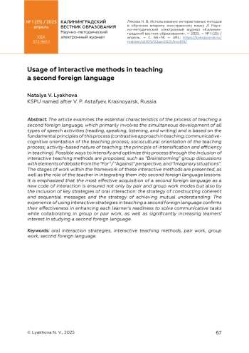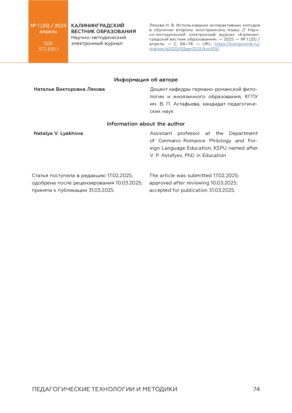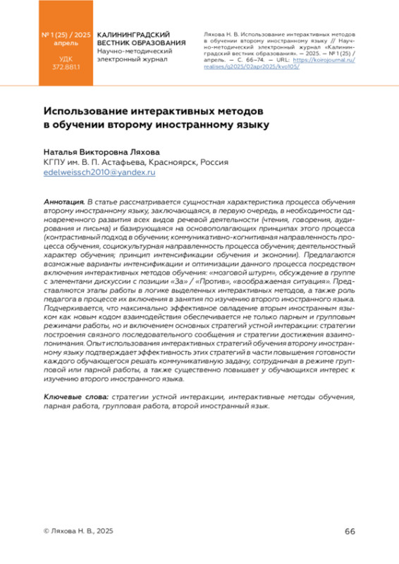 4. 	Ляхова, Н. В. Интеракция в коммуникативном иноязычном образовании: психолого-педагогический и методический аспекты / Н. В. Ляхова // Вестник Красноярского государственного педагогического университета им. В. П. Астафьева (Вестник КГПУ). - 2022. - № 1 (59). - С. 5-13.