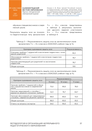 В статье представлены результаты третьей Российской психолого-педагогической олимпиады имени О. С. Гребенюка. Олимпиада проводится ежегодно с 2022 года и состоит из трех этапов. Результативность выполнения тестовых заданий школьного этапа возрастает от седьмого к одиннадцатому классу. Творческое задание второго этапа большинство участников выполнили в формате эссе, среди учеников 7-х — 8-х классов востребованным оказался и формат видеоролика. Качество выполнения творческого задания значительно увеличилось по сравнению с показателями прошлых олимпиад, особенно видеороликов и стендовых докладов. На финальном этапе участники также получили более высокие оценки по сравнению с прошлыми олимпиадами. Анализ результатов устного тура позволил обнаружить следующую тенденцию: участники осознают наличие проблем / трудностей и в воспитании подростков, и в обучении старшеклассников, охотно их озвучивают; при этом они продолжают «смотреть» на проблемы / трудности с позиции школьника. Чуть больше половины участников затрудняются сформулировать предложения для взрослых (педагогов / родителей) по воспитанию и обучению школьников-сверстников. У ряда участников определенные трудности вызывает и обоснование своей точки зрения, подбор соответствующих аргументов. Подготовка школьников к психолого-педагогической олимпиаде включает не только овладение предметным содержанием, но и целым рядом перспективных компетенций, помогающих школьнику в развитии психологической готовности к профессиональному самоопределению.