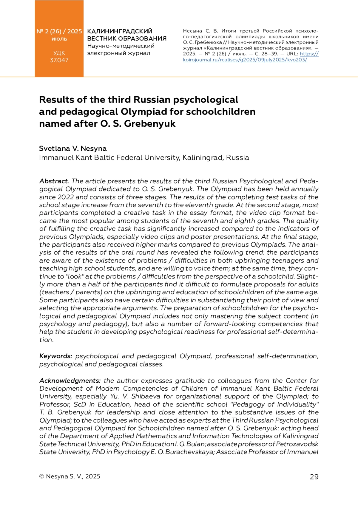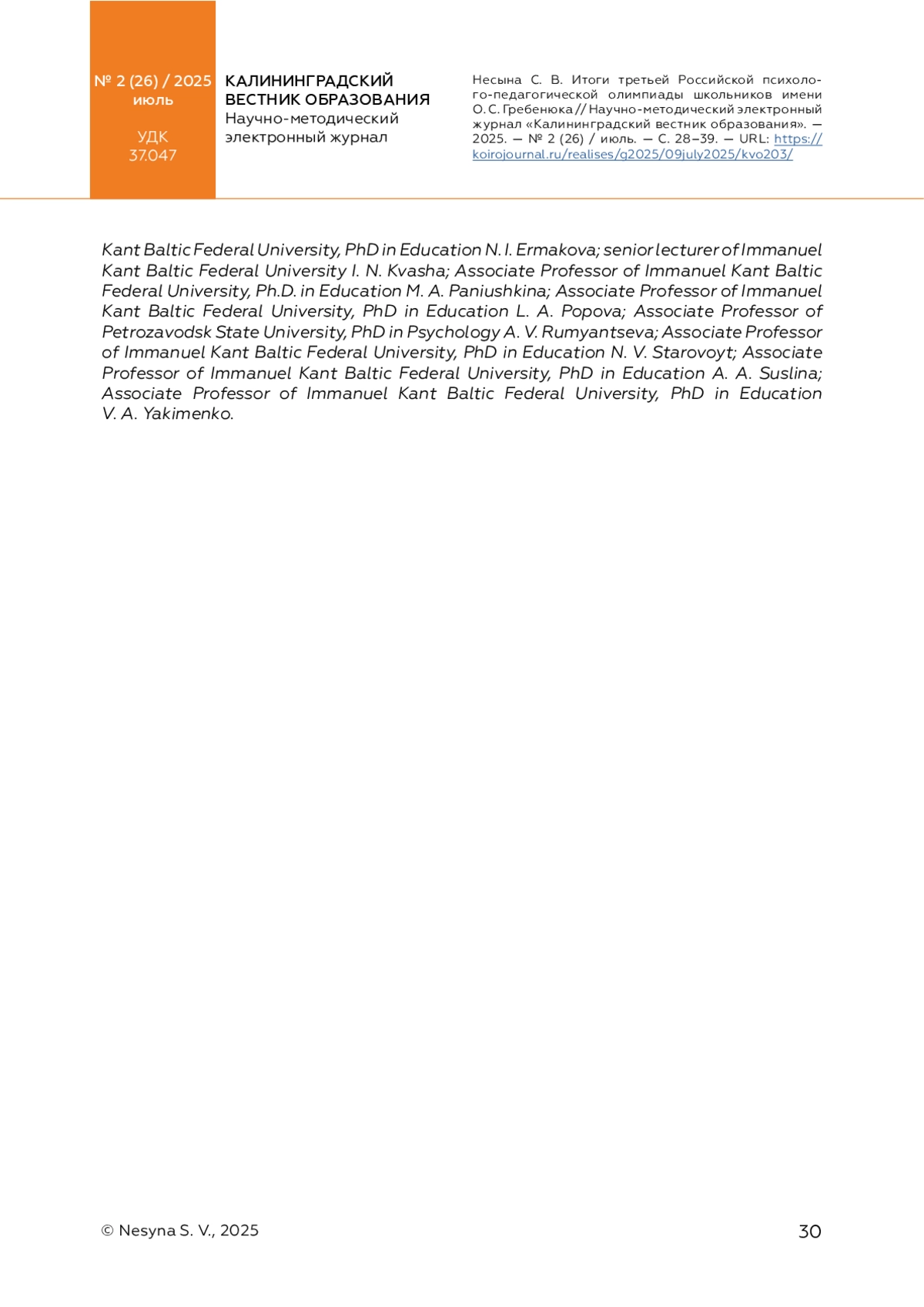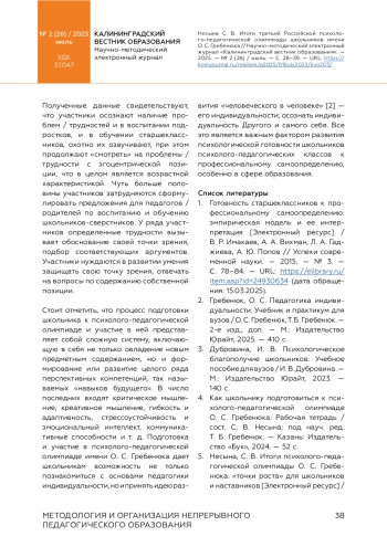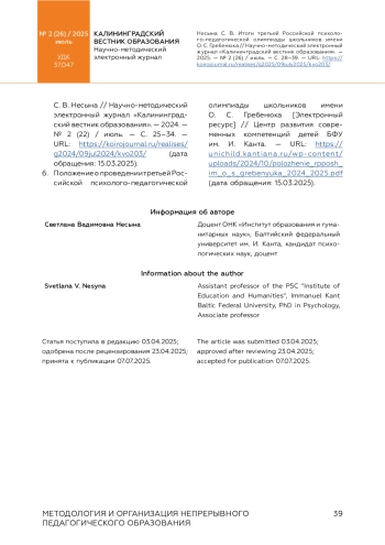 5. 	Несына, С. В. Итоги психолого-педагогической олимпиады О. С. Гребенюка: “точки роста” для школьников и наставников [Электронный ресурс] / С. В. Несына // Научно-методический электронный журнал “Калининградский вестник образования”. - 2024. - № 2 (22) / июль. - С. 25-34. - URL: https://koirojournal.ru/realises/g2024/09jul2024/kvo203/ (дата обращения: 15.03.2025).