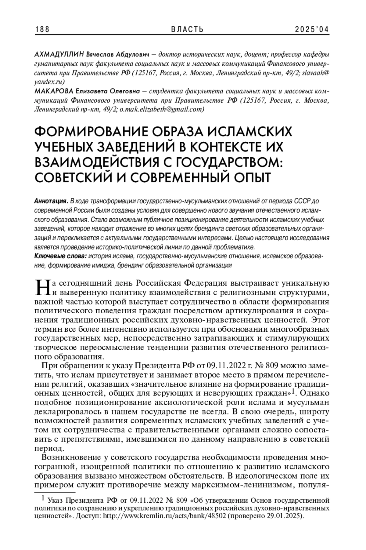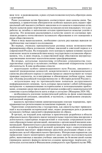 В ходе трансформации государственно-мусульманских отношений от периода СССР до современной России были созданы условия для совершенно нового звучания отечественного исламского образования. Стало возможным публичное позиционирование деятельности исламских учебных заведений, которое находит отражение во многих целях брендинга светских образовательных организаций и перекликается с актуальными государственными интересами. Целью настоящего исследования является проведение историко-политической линии по данной проблематике.