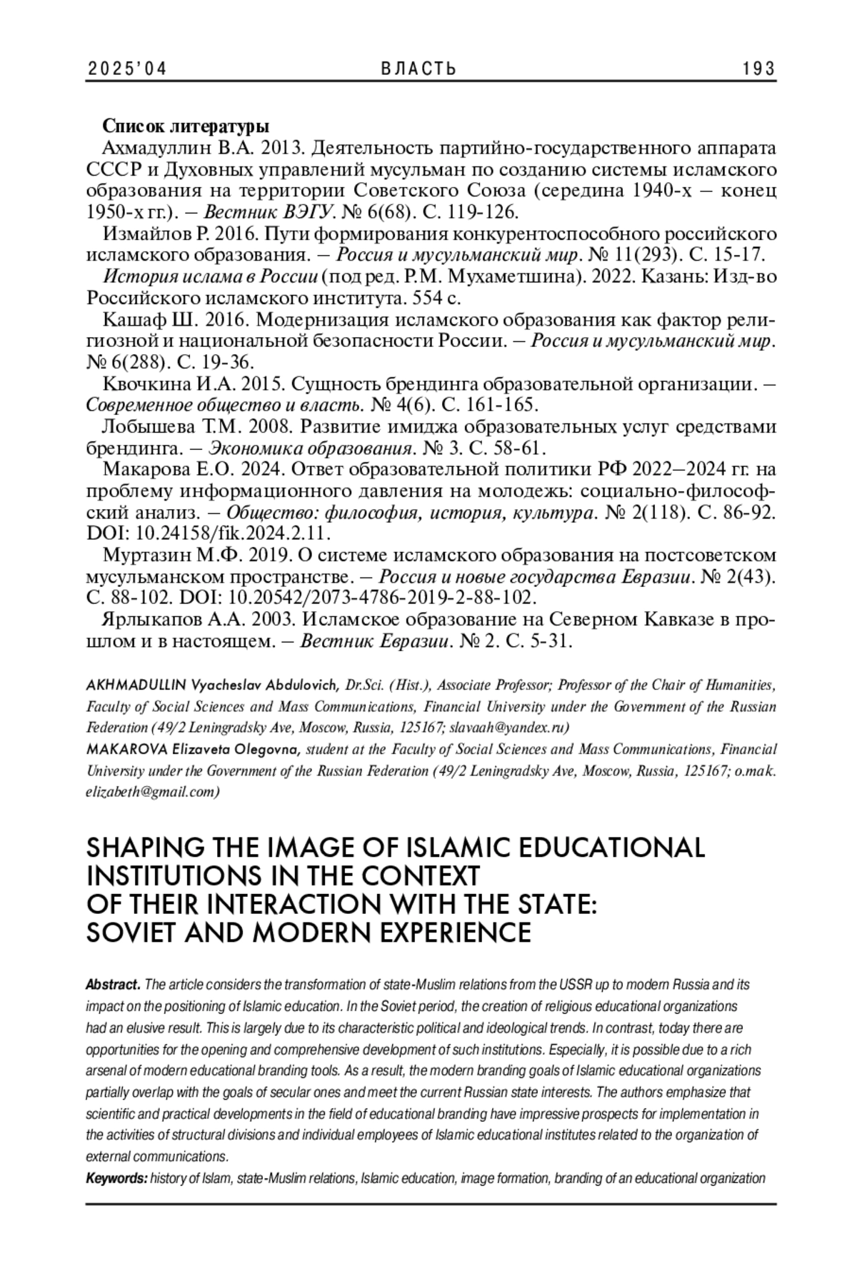2. 	Измайлов Р. 2016. Пути формирования конкурентоспособного российского исламского образования. - Россия и мусульманский мир. № 11(293). С. 15-17. EDN: XGWZUD