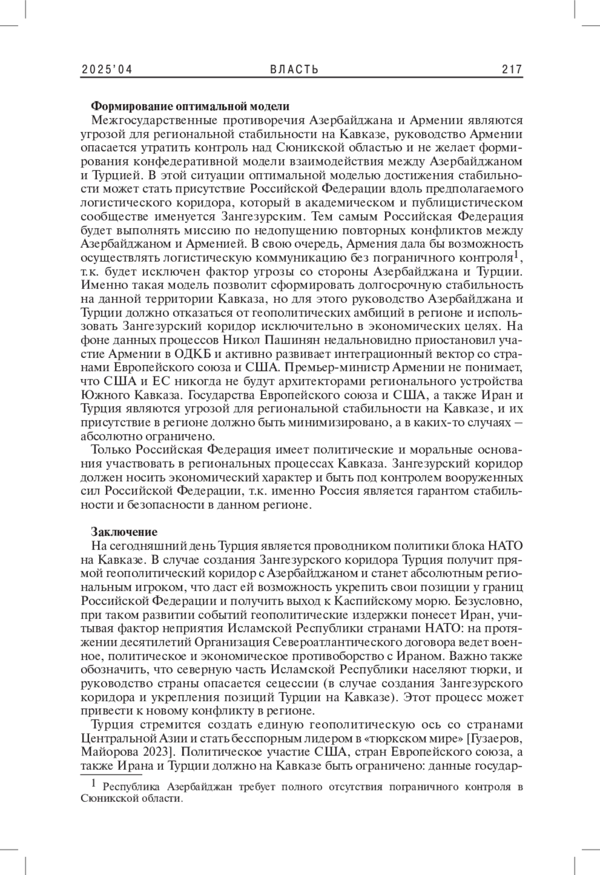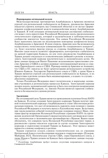 Создание Зангезурского коридора представляет собой сложный геополитический процесс, который выходит за рамки простого инфраструктурного проекта и является отражением геополитической конкуренции Ирана и стран НАТО на Кавказе. На протяжении многих лет Турция стремится изменить баланс сил на Кавказе, продвигая политику блока НАТО в регионе. Страны военно-политического блока не хотят учитывать важный факт, что государства Южного Кавказа являются постсоветским пространством, и данный регион граничит с Российской Федерацией. Азербайджан и Турция рассматривают коридор как стратегический инструмент для региональной интеграции и укрепления своих геополитических позиций. Армения, напротив, воспринимает данный проект как угрозу территориальной целостности, что еще больше обостряет конфликтную динамику в двусторонних отношениях с Азербайджаном. В свою очередь, Иран находится в оппозиции по отношению к геополитическим планам Азербайджана и Турции, т. к. опасается изменения регионального транзитного порядка и ослабления собственных позиций на Южном Кавказе. И тут важно обозначить, что Российская Федерация является единственной страной, которая имеет моральные и политические основания участвовать в региональных процессах Южного Кавказа: Россия стремится сохранить стратегическое равновесие на Южном Кавказе, минимизируя уровень эскалации в регионе, а также является единственной страной, которая обладает высоким уровнем профессионализма в ведении миротворческих миссий и поиске путей по стабилизации политических процессов в регионах.