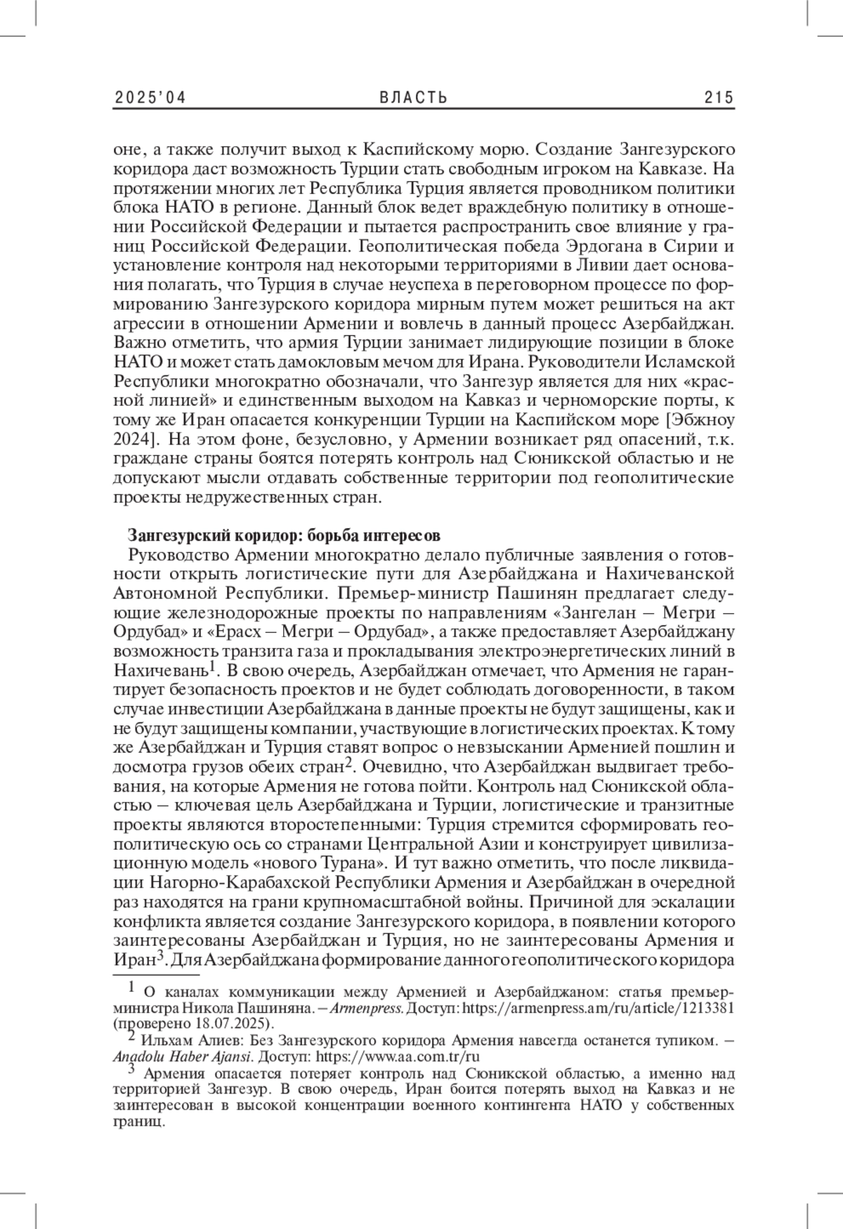 1. Алексанян Л.М. 2023. Роль Южно-Кавказского региона во внешней политике Турции на современном этапе (на примере Азербайджана). - Социальные и гуманитарные науки. Отечественная и зарубежная литература. Сер. 9. Востоковедение и африканистика. № 4. С. 35-46. DOI: 10.31249/RVA/2023.04.03