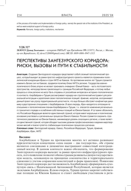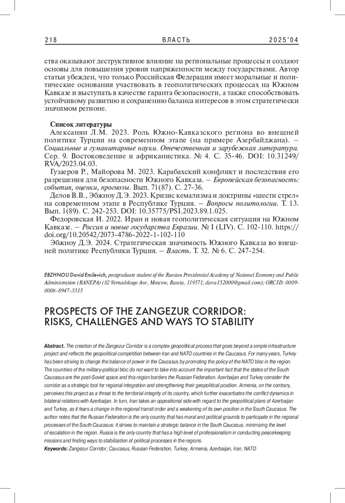 5. Эбжноу Д.Э. 2024. Стратегическая значимость Южного Кавказа во внешней политике Республики Турция. - Власть. Т. 32. № 6. С. 247-254. EDN: REKAUL