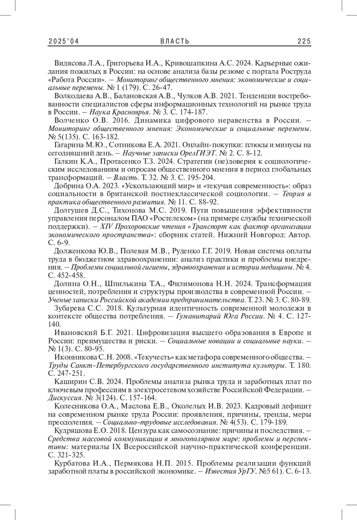 5. Видясова Л.А., Григорьева И.А., Кривошапкина А.С. 2024. Карьерные ожидания пожилых в России: на основе анализа базы резюме с портала Роструда “Работа России”. - Мониторинг общественного мнения: экономические и социальные перемены. № 1 (179). С. 26-47. EDN: OKOFJO