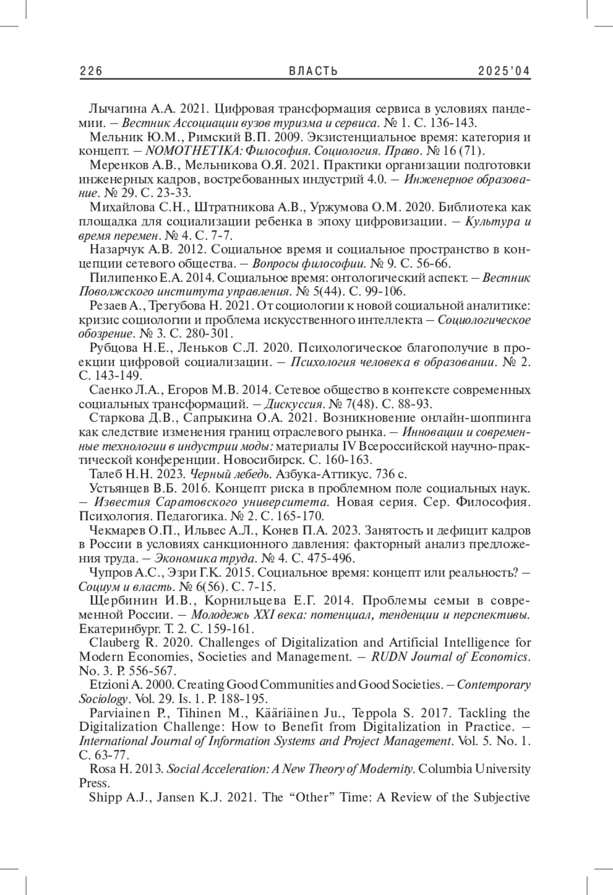 25. Назарчук А.В. 2012. Социальное время и социальное пространство в концепции сетевого общества. - Вопросы философии. № 9. С. 56-66. EDN: PFEWGH