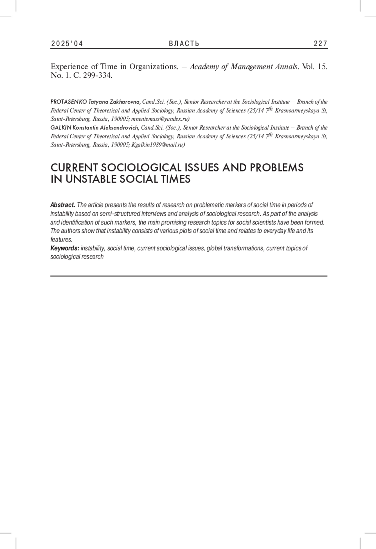 В статье представлены результаты исследований проблемных маркеров социального времени в периоды нестабильности на основе полуструктурированных интервью и анализа социологических исследований. В рамках проведенного анализа и выделения подобных маркеров сформированы основные перспективные темы исследований для ученых-обществоведов. Нестабильность рассматривается как состоящая из различных сюжетов социального времени и связанная с повседневностью и ее особенностями.