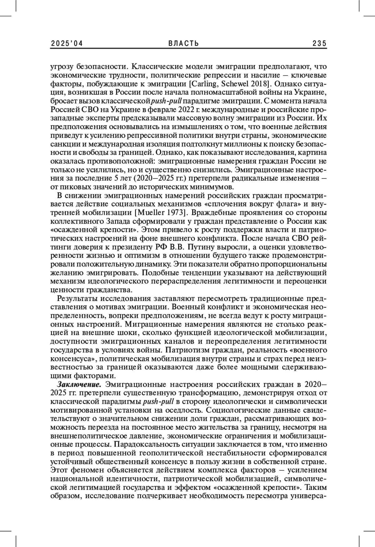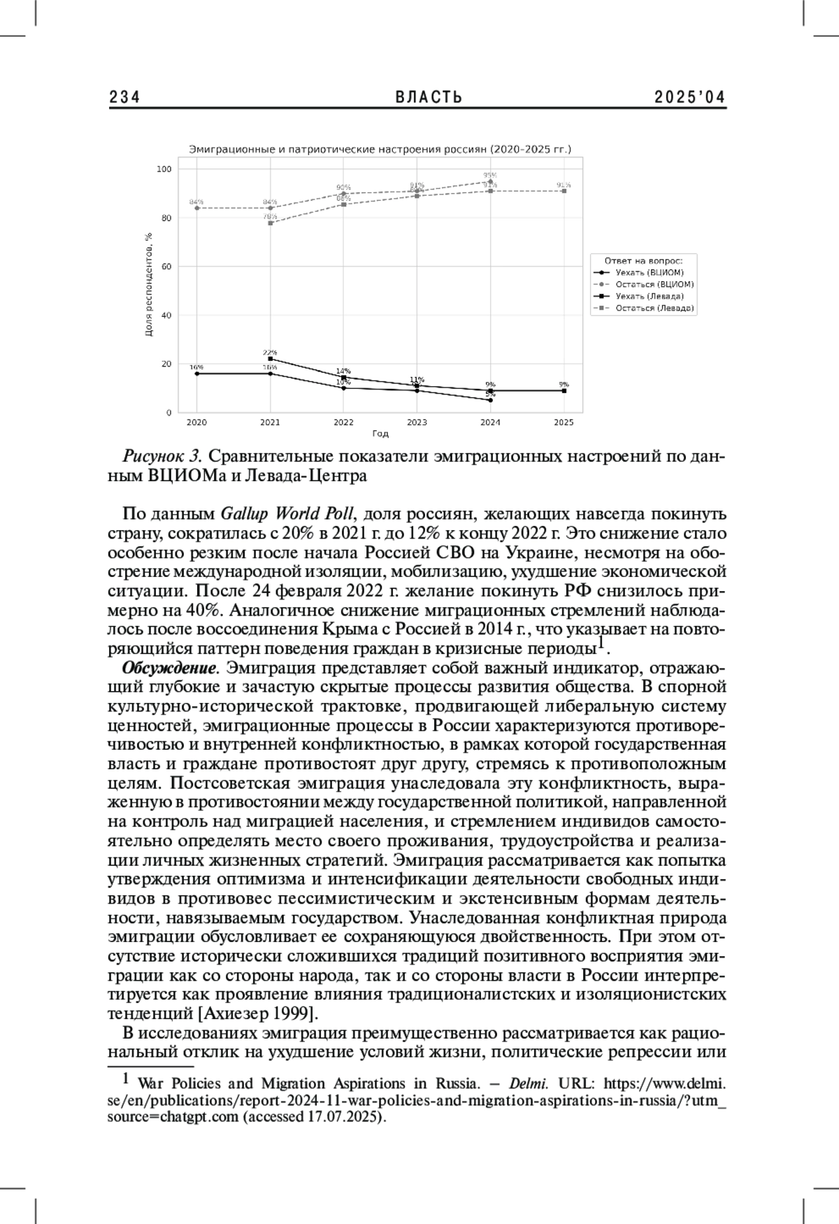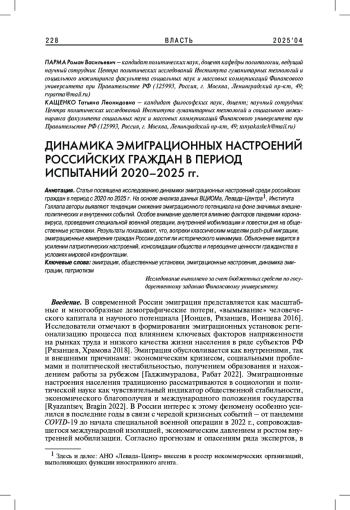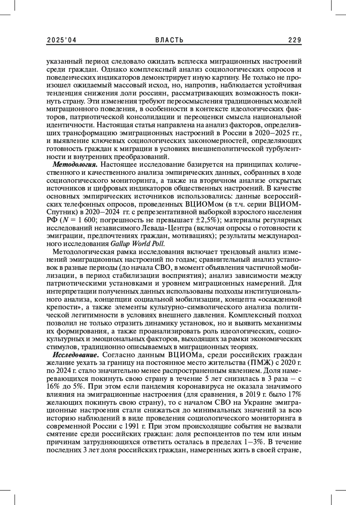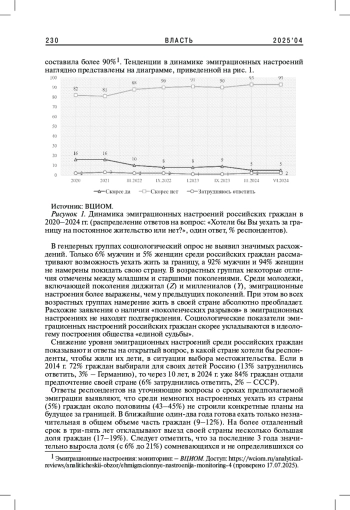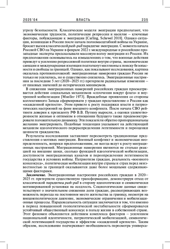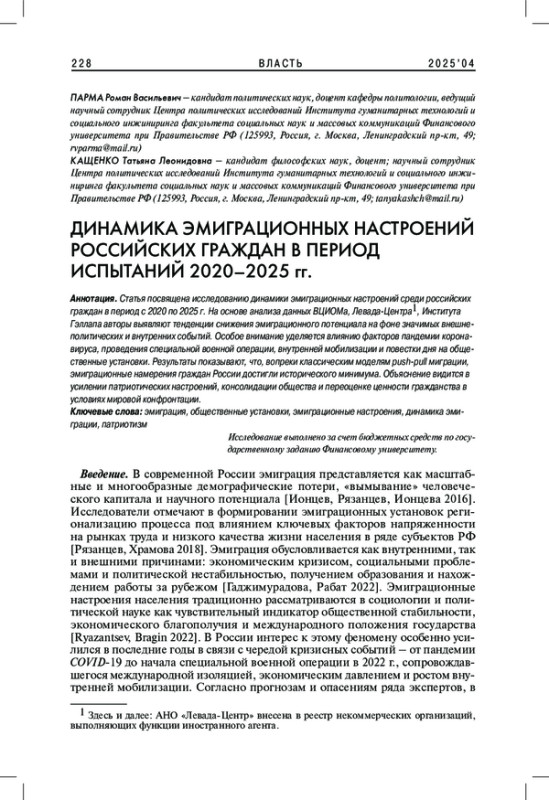 Статья посвящена исследованию динамики эмиграционных настроений среди российских граждан в период с 2020 по 2025 г. На основе анализа данных ВЦИОМа, Левада-Центра, Института Гэллапа авторы выявляют тенденции снижения эмиграционного потенциала на фоне значимых внешнеполитических и внутренних событий. Особое внимание уделяется влиянию факторов пандемии коронавируса, проведения специальной военной операции, внутренней мобилизации и повестки дня на общественные установки. Результаты показывают, что, вопреки классическим моделям push-pull миграции, эмиграционные намерения граждан России достигли исторического минимума. Объяснение видится в усилении патриотических настроений, консолидации общества и переоценке ценности гражданства в условиях мировой конфронтации.