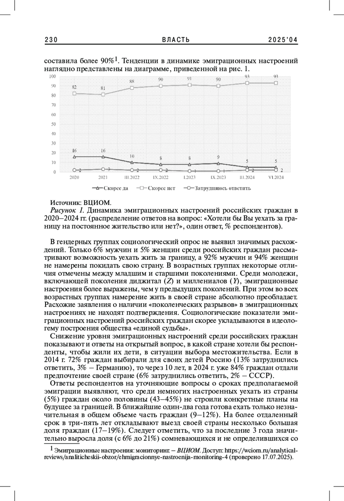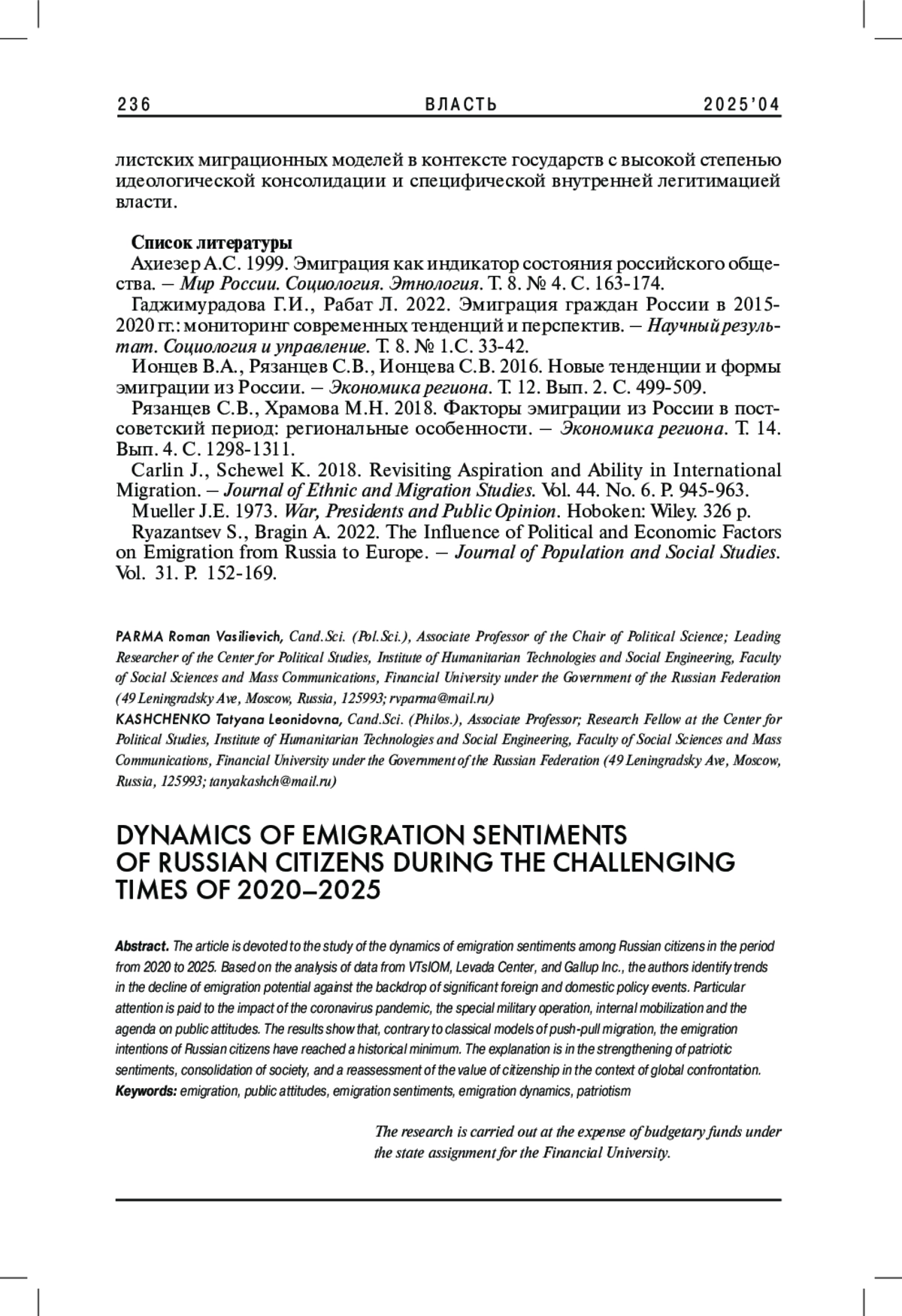 1. 	Ахиезер А.С. 1999. Эмиграция как индикатор состояния российского общества. - Мир России. Социология. Этнология. Т. 8. № 4. С. 163-174. EDN: RWMJJS