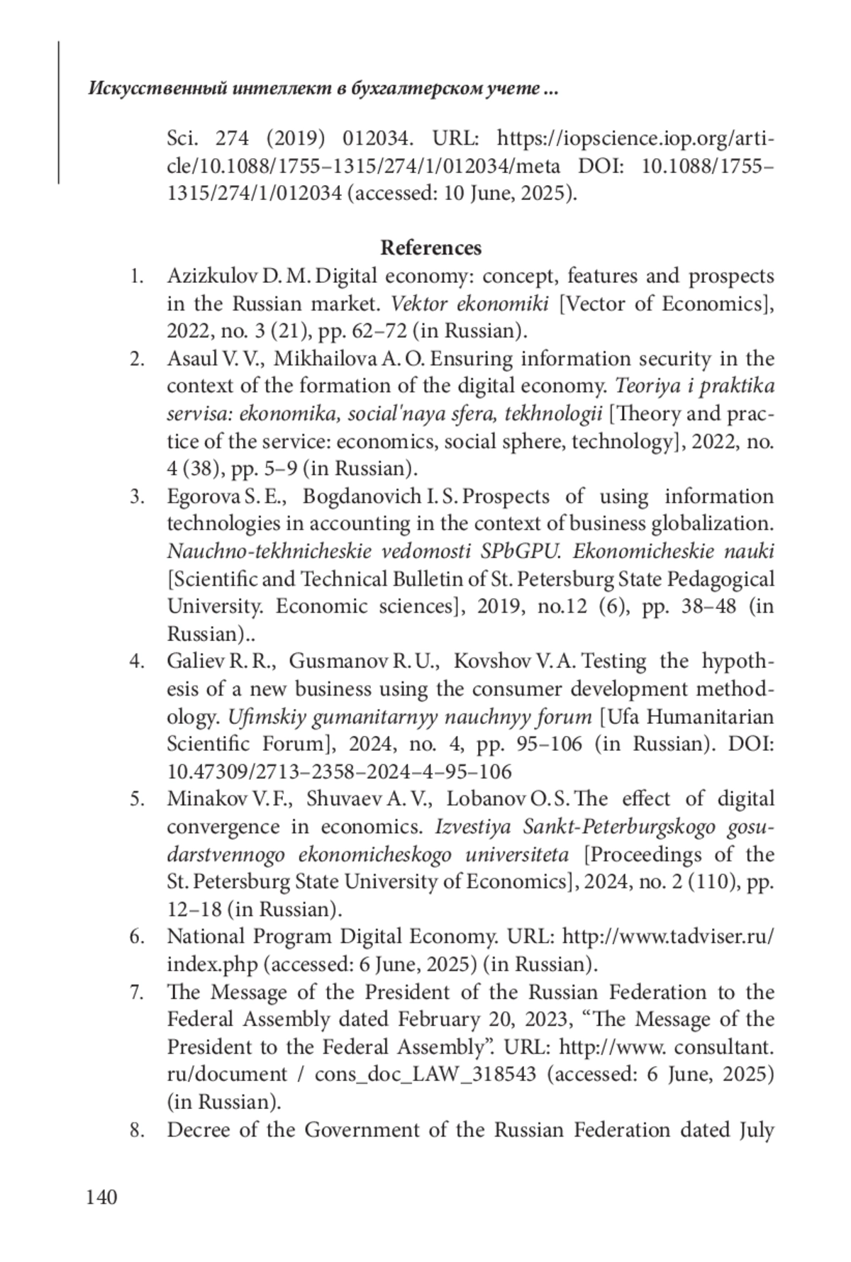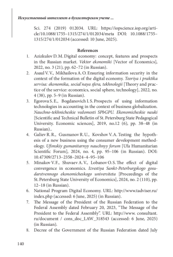 1. 	Азизкулов Д. М. Цифровая экономика: понятие, особенности и перспективы на российском рынке // Вектор экономики. 2022. № 3 (21). С. 62-72.
