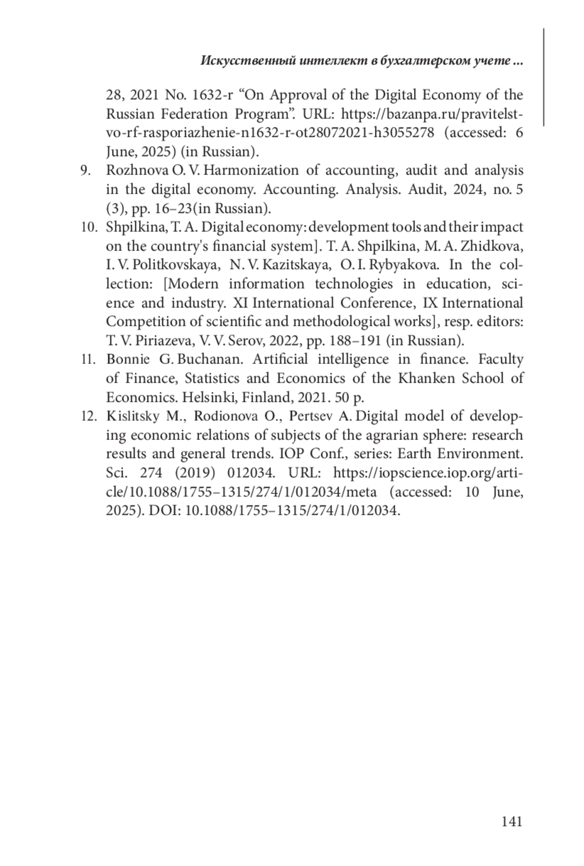 9. 	Рожнова О. В. Гармонизация учета, аудита и анализа в условиях цифровой экономики // Учет. Анализ. Аудит. 2024. № 5 (3). C. 16-23.