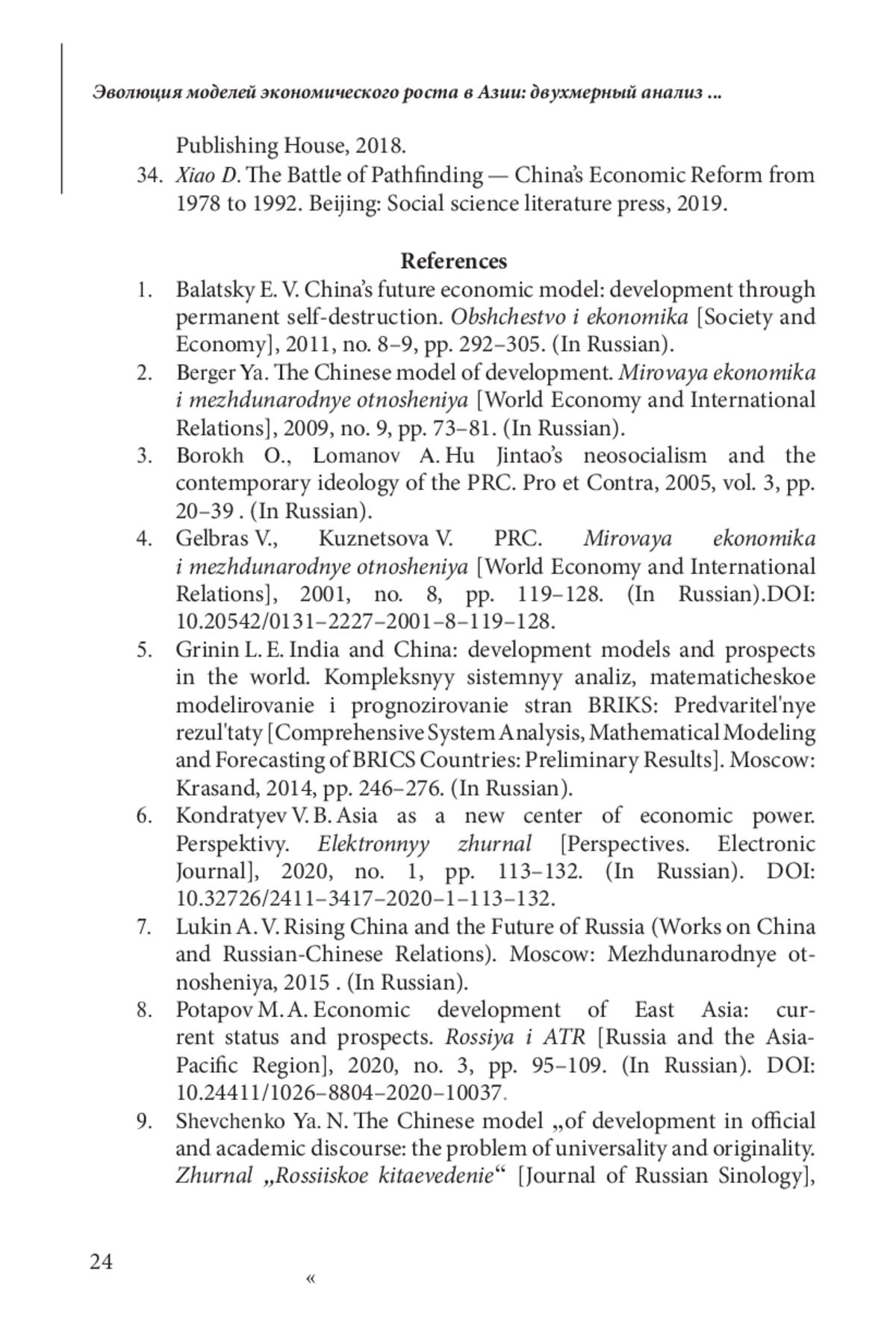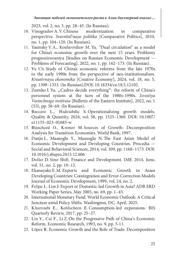 13. 	Ясинский В. А., Кожевников М. Ю. “Двойная циркуляция” - модель роста китайской экономики на ближайшие 15 лет // Проблемы прогнозирования. 2022. № 1. С. 162-173.