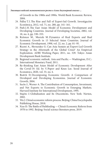 26. 	Rahman M., Mustafa M. Dynamics of Real Exports and Real Economic Growth in 13 Selected Asian Countries. Journal of Economic Development, 1998, vol. 22, no. 2, pp. 81-95.