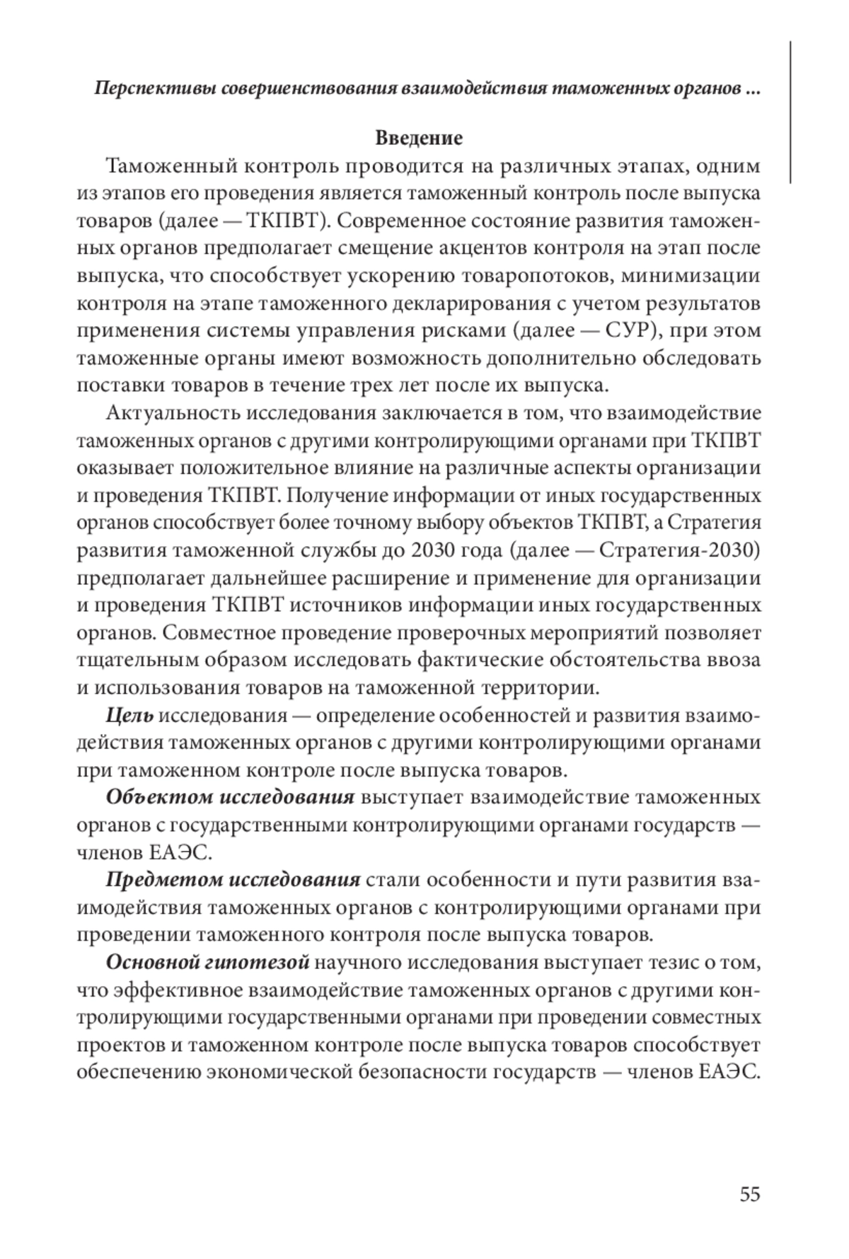 Таможенный контроль проводится на различных этапах, одним из этапов его проведения является таможенный контроль после выпуска товаров (далее — ТКПВТ). Современное состояние развития таможенных органов предполагает смещение акцентов контроля на этап после выпуска, что способствует ускорению товаропотоков, минимизации контроля на этапе таможенного декларирования с учетом результатов применения системы управления рисками (далее — СУР), при этом таможенные органы имеют возможность дополнительно обследовать поставки товаров в течение трех лет после их выпуска.