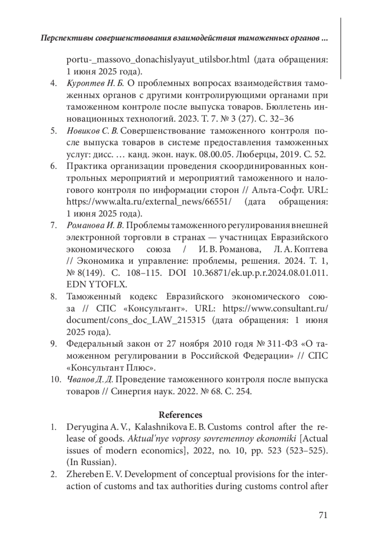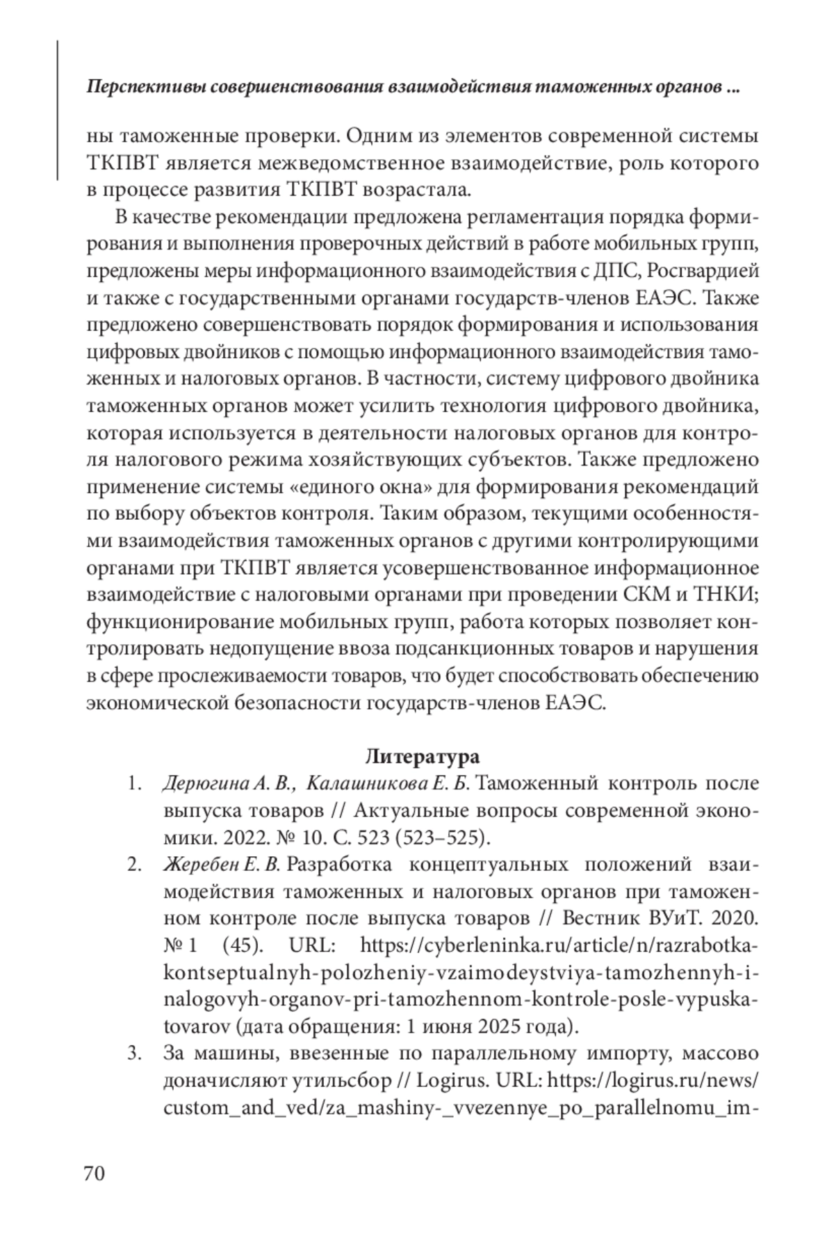 2. 	Жеребен Е. В. Разработка концептуальных положений взаимодействия таможенных и налоговых органов при таможенном контроле после выпуска товаров // Вестник ВУиТ. 2020. № 1 (45). URL: https://cyberleninka.ru/article/n/razrabotka-kontseptualnyh-polozheniy-vzaimodeystviya-tamozhennyh-i-nalogovyh-organov-pri-tamozhennom-kontrole-posle-vypuska-tovarov (дата обращения: 1 июня 2025 года).