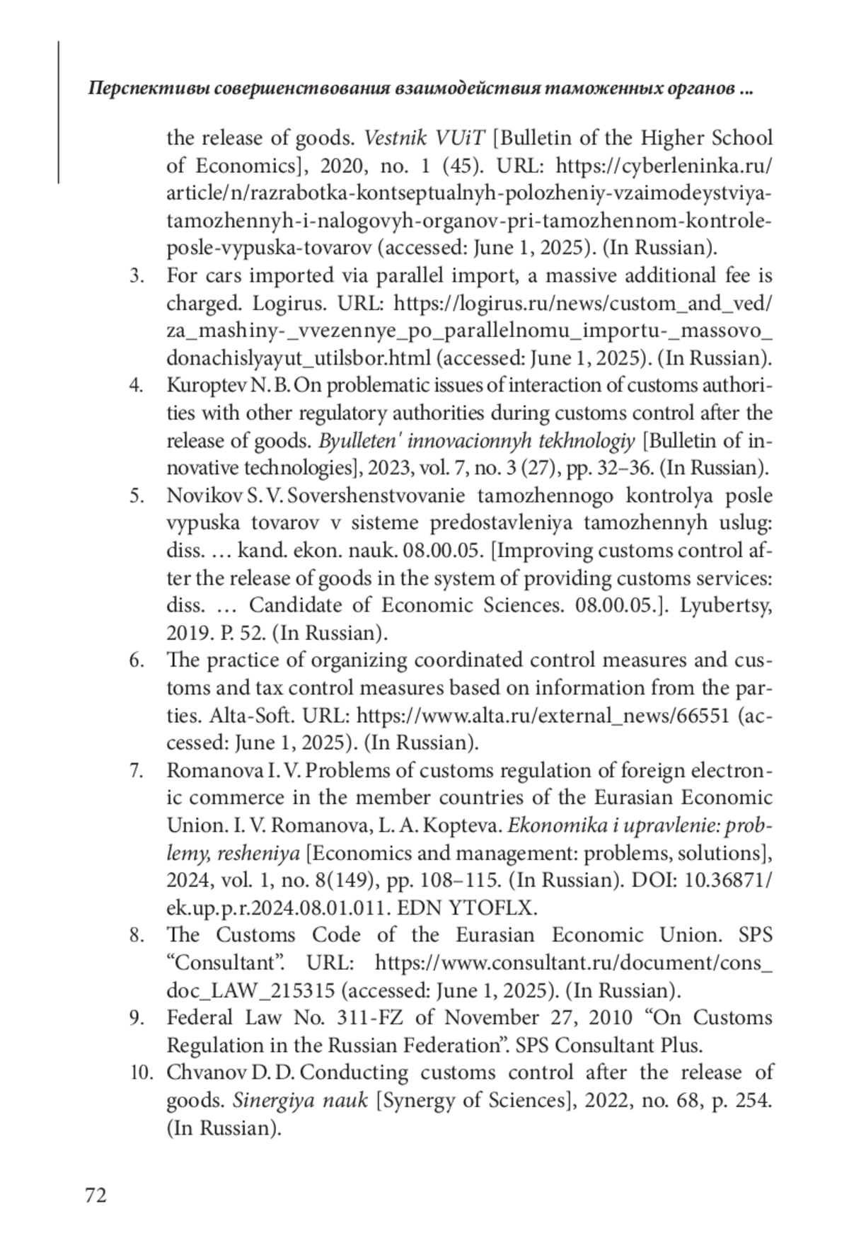 10. 	Чванов Д. Д. Проведение таможенного контроля после выпуска товаров // Синергия наук. 2022. № 68. С. 254.